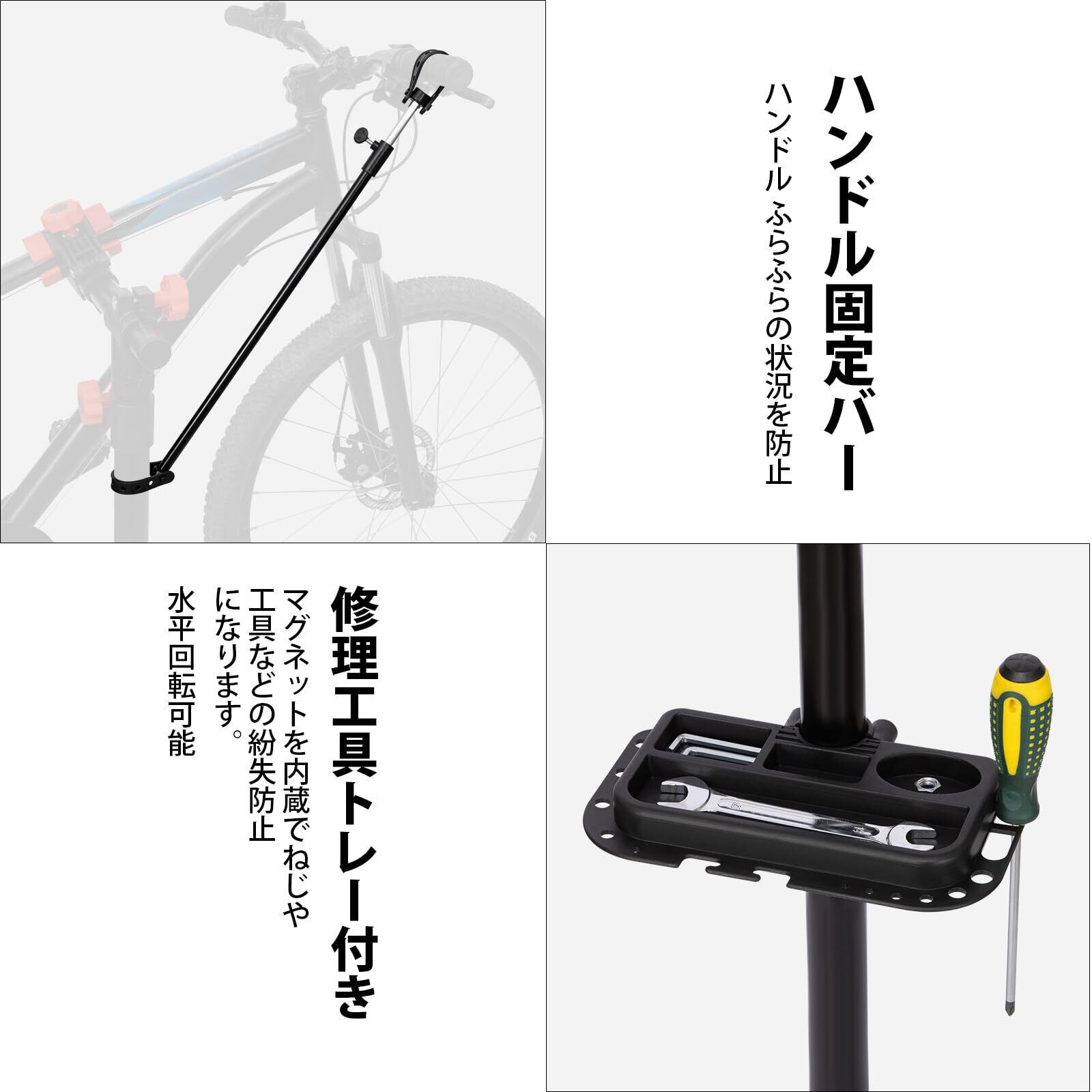 【良い高さで作業】自転車の修理を行う際、常に腰を曲げる作業が必要で、腰が痛くなったり、苦労した経験があるのではないでしょうか。この作業スタンドを使えば、自転車のメンテナンス作業を簡単にすることができます。吊り下げ設計で、角度も高さも自由に調整可能で、立ったり座ったりしながらより快適に作業を完了できます。しっかり固定できるので自転車がぐらつく事もない。