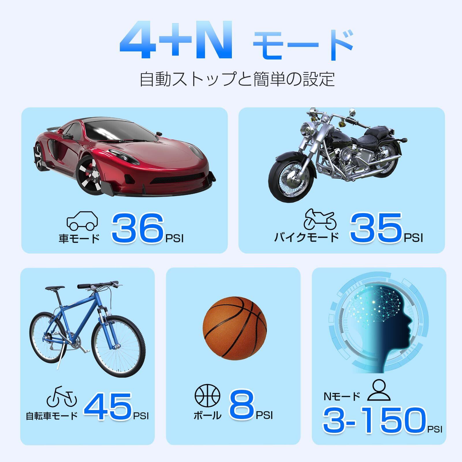 【4+Nスマートモード&圧力単位切替可能】自動車空気入れは、4+Nのスマートモードをセットしており、車モード(36PSI)、バイクモード(35PSI)、自転車モード(45PSI)、ボール(8PSI)の充気モードがプリセットされており、面倒な圧力設定を手動で調整する必要がなく、初心者でも簡単に使えます。さらに、Nモード(3-150PSI)が追加されており、希望の圧力を勝手に設定できる。PSI、BAR、KPA、KG/CM²の4つの圧力単位が選べ、どの国や地域でも使用できる汎用性備えています。シーンやアイテムに合わせて最適な充填を簡単に実現でき、使い勝手の良さが際立っています。