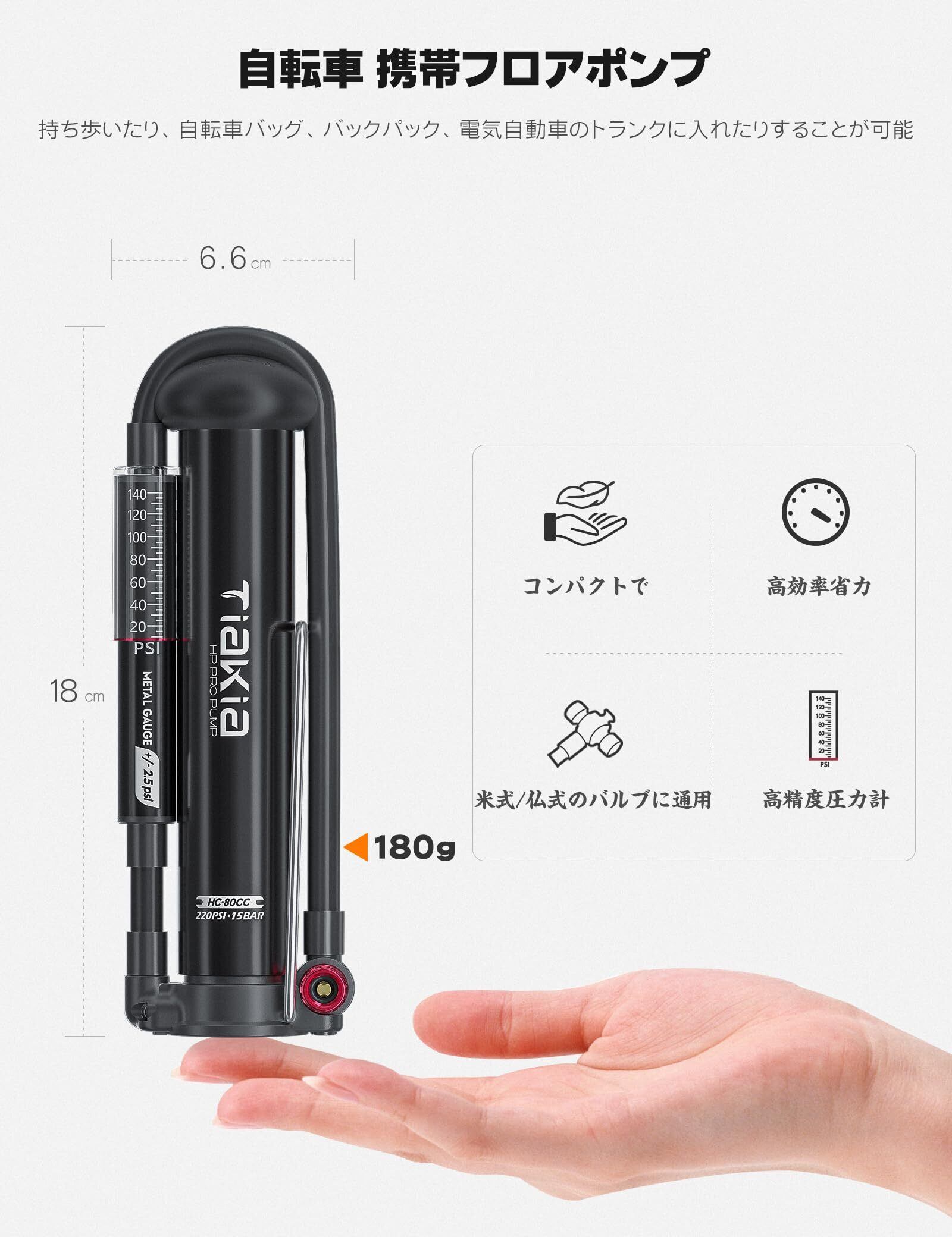 Tiakia 自転車 空気入れ フロアポンプ 米式/英式/仏式 バルブ対応 携帯 ポンプ コンパクト 圧力計付き ロードバイク クロスバイク くうきいれ 小型 220PSI /15Bar 省力 耐久 アルミ合金製 収納便利
