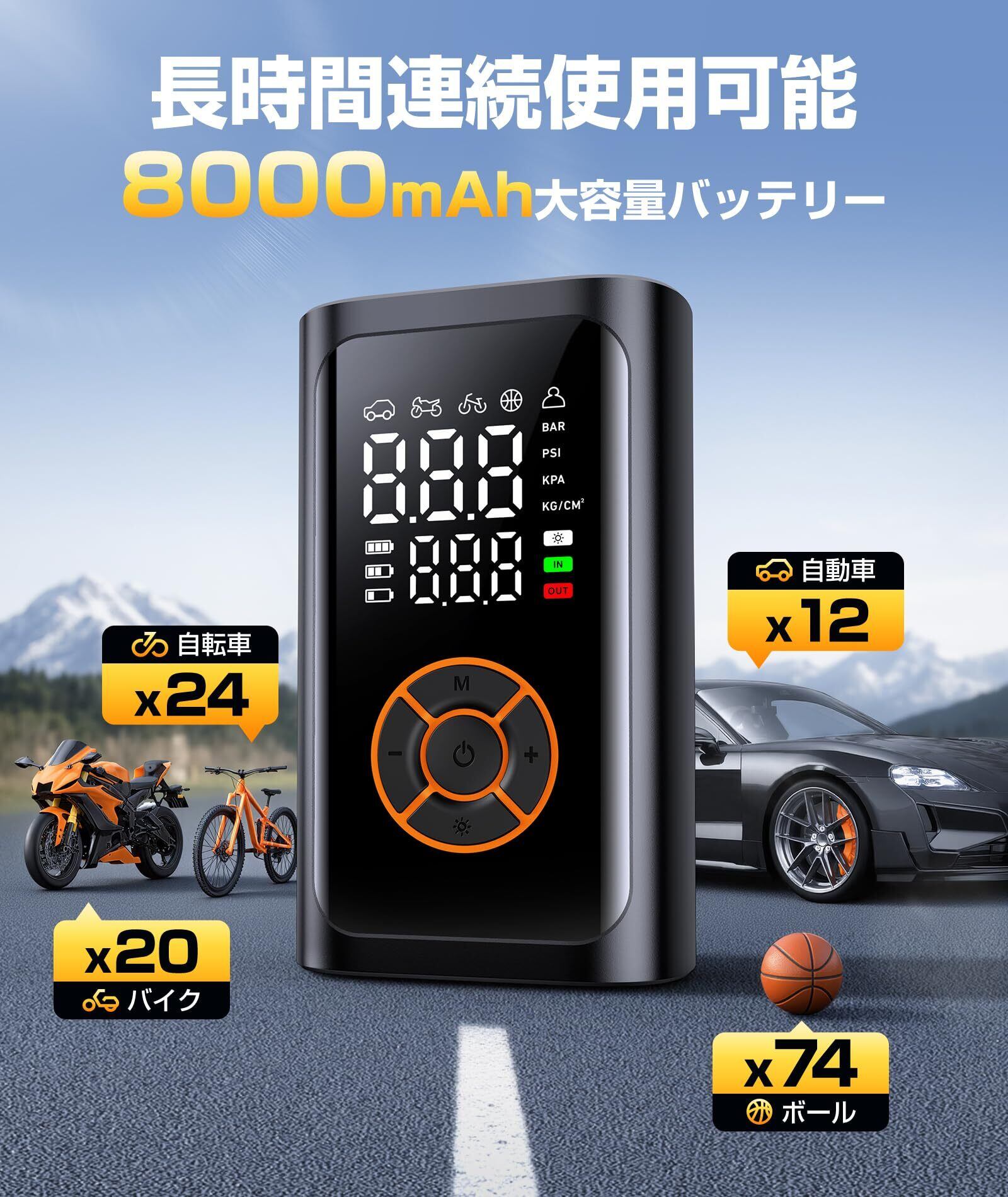 自転車 空気入れ 電動空気入れ バイク150PSI 高速充填 自動停止 エアーポンプ 大容量電池 仏/英/米式バルブ対応 5モード切替 LEDライト付き LCD表示 コードレス コンパクト 自転車/バイク/車/浮き輪/ボール対応 Type-C 充電式 モバイルコンプレッサー 収納袋 日本語取扱説明書付き