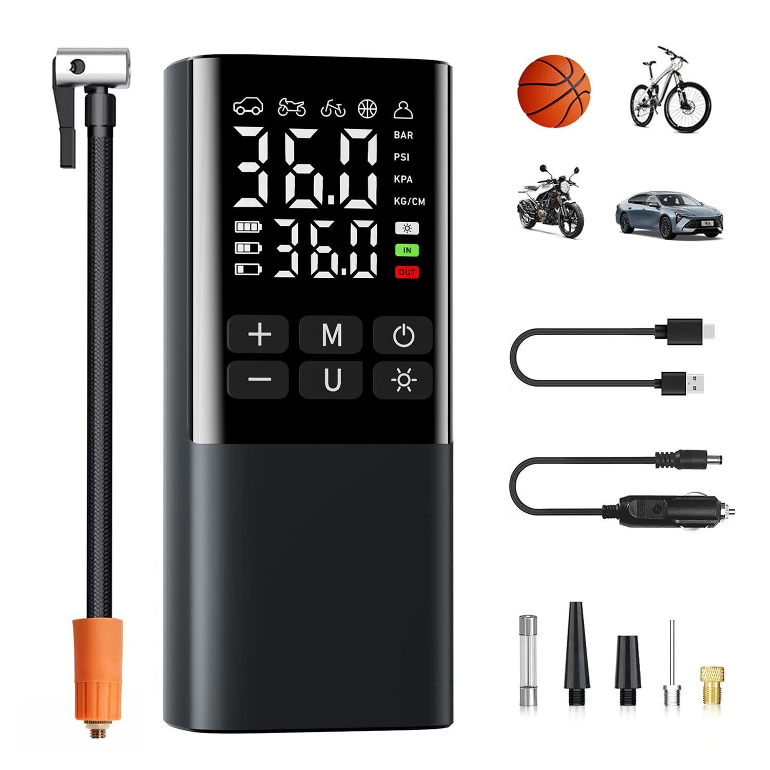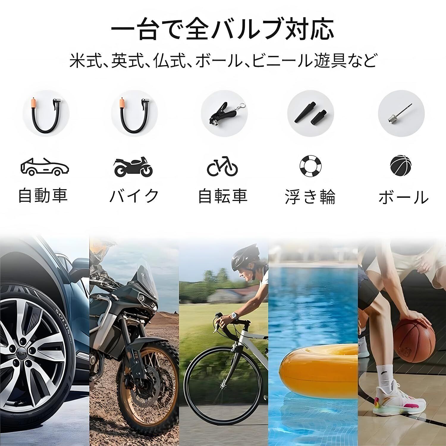 【1台で多用途&軽量コンパクト設計】この電動空気入れは、英・仏・米式およびボールバルブに対応しており、自転車・バイク・車・SUV・トラック・ボールなど幅広く使用可能です。 ワンタッチ操作で数分以内に空気を注入でき、初めての方でも簡単に扱えます。コードレス&軽量(16.5×7.2×5.2cm/約480g)で、旅行やドライブ中でも場所を取らず持ち運びが便利。️ いつでもどこでもタイヤの空気を補充でき、安全なドライブをサポートします。※初回使用前は必ず満充電にしてください。