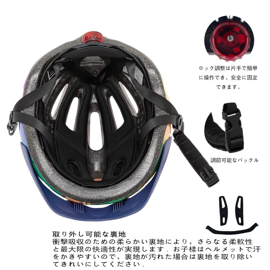 【セキュリティと保護】この子供用ヘルメット 自転車は、丈夫で耐久性のある PC シェルと軽量の衝撃吸収 EPS フォームが衝撃を吸収し、衝突時の子供の頭部への衝撃による損傷を最小限に抑えます。自転車ヘルメット子供用 小学生厚くて柔らかいヒートシールされた裏地と自転車用ヘルメットのあごパッドは、子供の頭を摩耗から効果的に保護します。自転車用 ヘルメットには、安全インジケーターの 3 つのモード (長い点灯/遅い点滅/速い点滅) があり、曇りの日や夜間の走行時にお子様の安全性を高めます。バッテリーの電力がなくなったら、CR2032 リチウム金属バッテリーを時間内に交換してください
