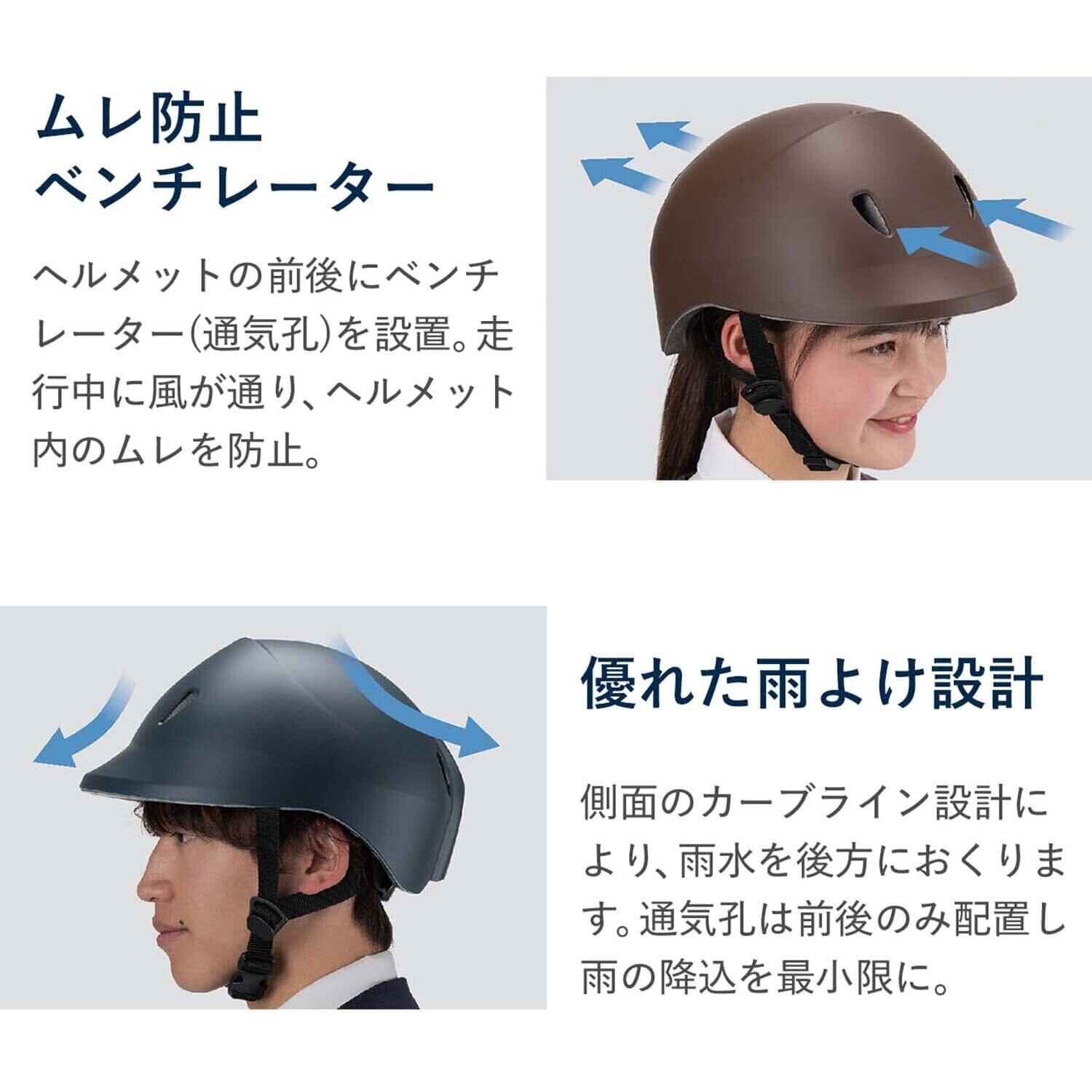 SG規格合格品である、中高生向け自転車用ヘルメットS-Mサイズです。安心の日本製で、通学時や休みの日などあらゆるシーンに溶け込むシンプルでベーシックなデザイン。外側のハードシェルには耐久性に優れたAES樹脂を採用。ライナーには発泡体を使用した二重構造で、頭への衝撃を吸収・分散してくれます。後部のアジャスターは、被ったままワンタッチで簡単にサイズ調整が可能です。前後方に通気孔を備えており、走行中に風が通ることでヘルメット内の蒸れを防止します。