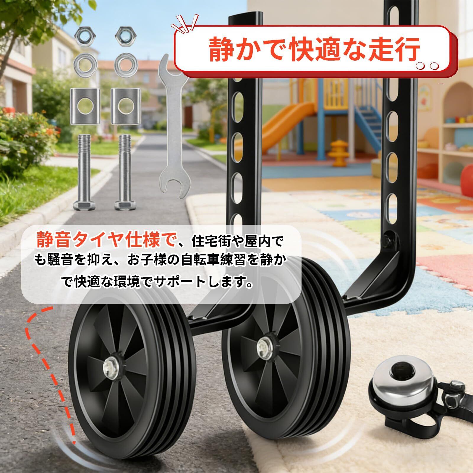 【静かで快適な走行】静音タイヤ仕様で、住宅街や屋内でも騒音を抑え、お子様の自転車練習を静かで快適な環境でサポートします。