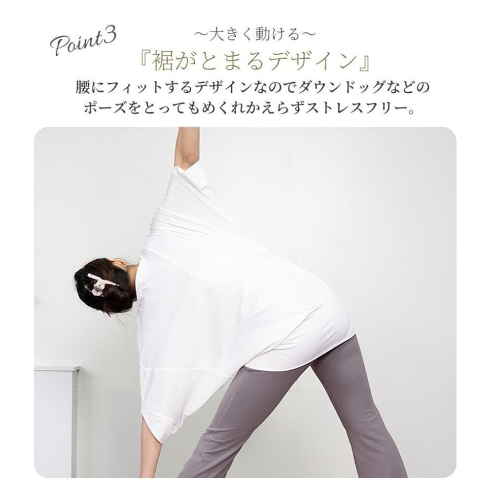 【めくれかえらず安心】ダウンドッグなど逆転系のポーズをとってもめくれず安心。身体を締め付けず、ゆったりと着れます。窮屈感ゼロ、身体を締め付けず、ゆったりと着れます。窮屈感ゼロ、体型の悩みをカバーするリラックスシルエット。気になるヒップ、わき、肩、腰周りを全てカバーしてくれ、長い着丈で周りの視線を気にせず動きに集中できます。