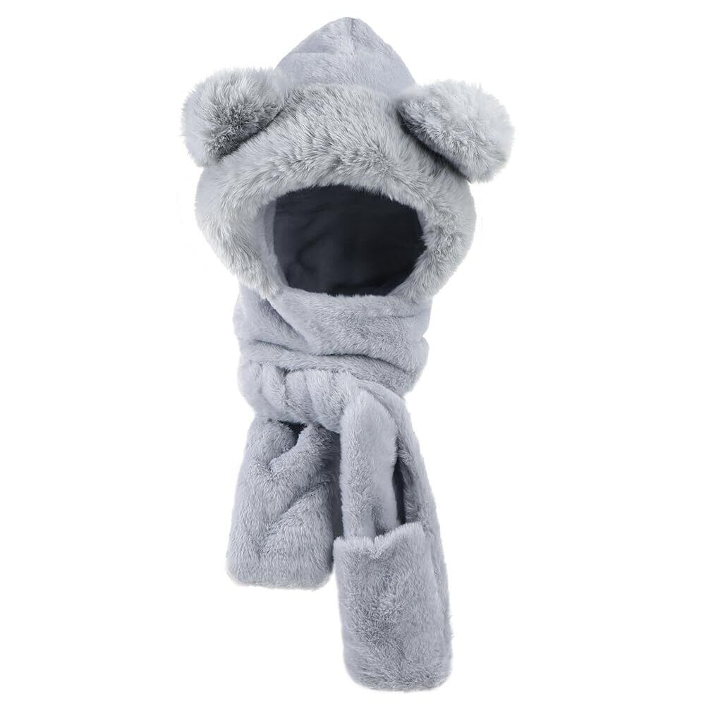 [XYGJJP] 子供 防寒帽 マフラー 手袋 付き 3点 一体 クマ 秋冬 4-12歳 キッズ グローブ付き アニマル帽子 スカーフ 女の子 学生 おしゃれ ふわふわ フード付きマフラー ミトン キャップ お出かけ 幼稚園 あったか 防寒帽子 プレゼント