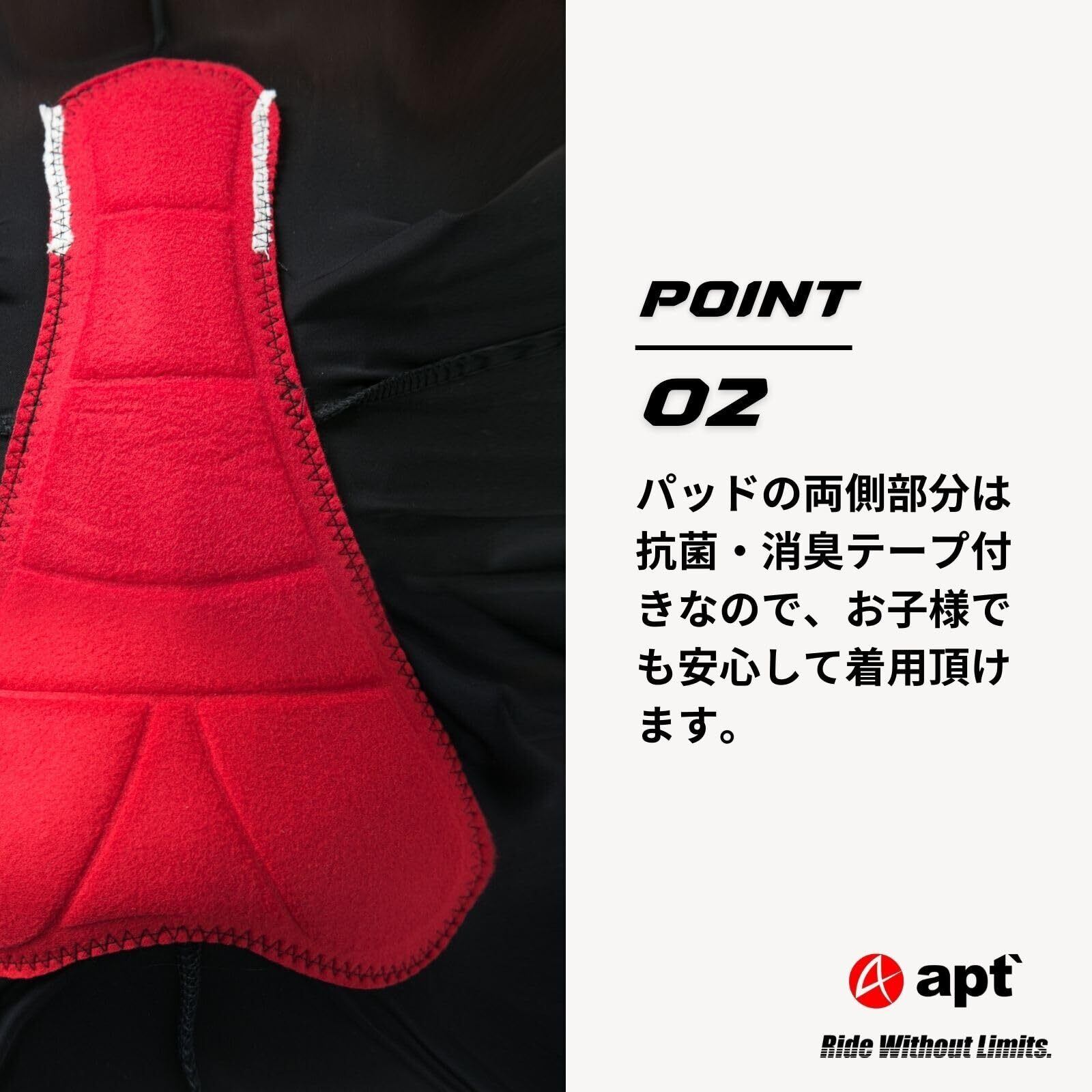 ウエスト部分にはずり下がりを防止するためのテープが付いているため、しっかりとフィットします。さらに、左太もも部分には反射素材のapt'ロゴマークが付いており、夜間の安全性も考慮されています。