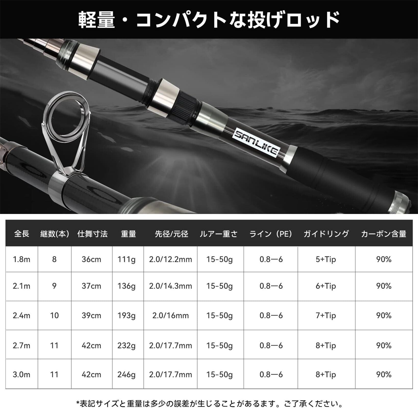 サンライク(SANLIKE)コンパクトロッド 投げ竿 釣り竿 振出ロッド フィッシングロッド 90%カーボン率 釣竿セット サビキ さびき 川釣り 淡水釣り 超軽量 携帯型 伸縮式 入門 釣竿 初心者 子供 1.8m/2.1m/2.4m/2.7m/3.0m