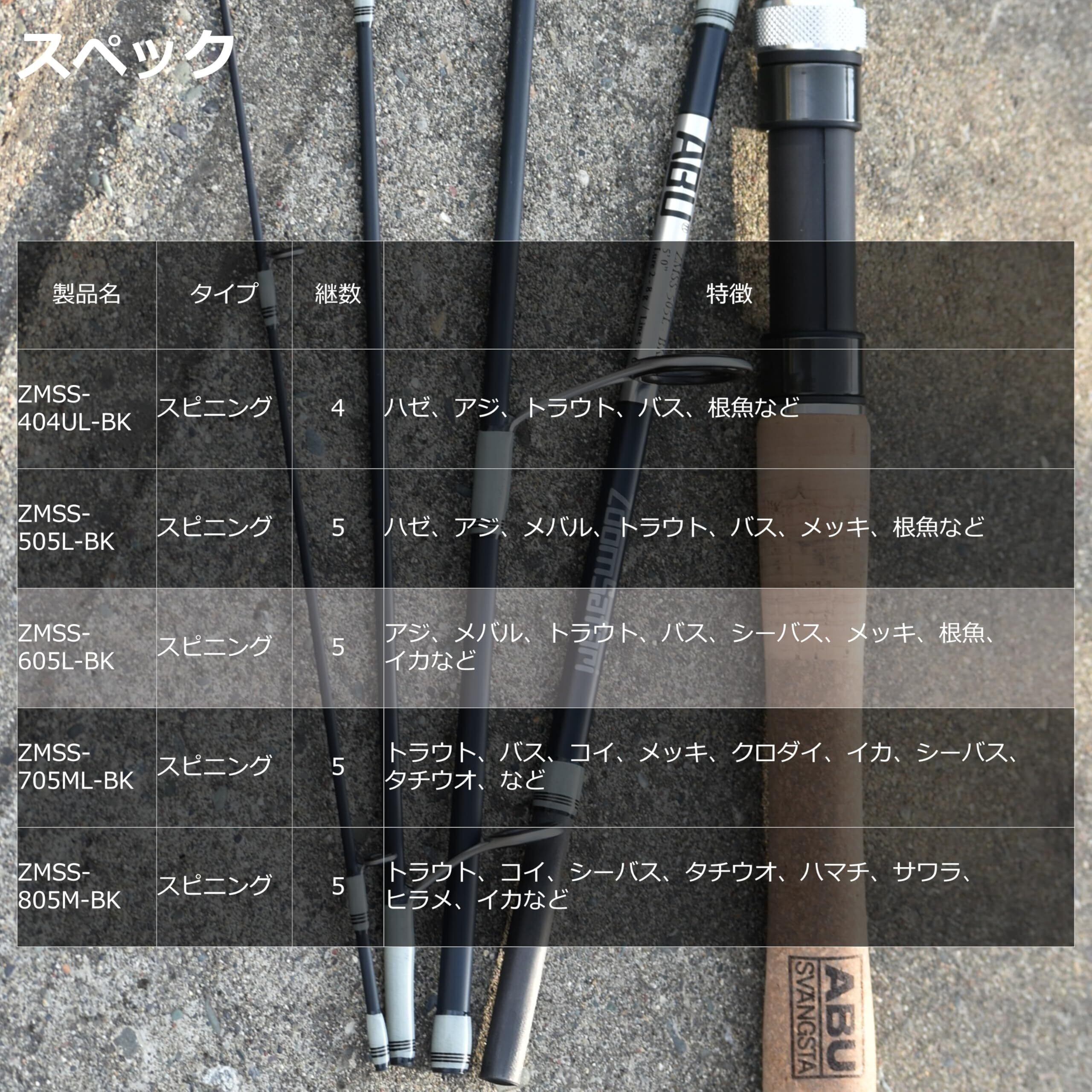 全長 (ft/cm)6'0" / 183●仕舞 (cm)42●標準自重 (g)122●ルアー (g)2~10●ライン (lb)4~8●使用材料カーボン95%,グラス5%●パワーL/ライト●テーパー/アクションF/ファースト ●製法チューブラー