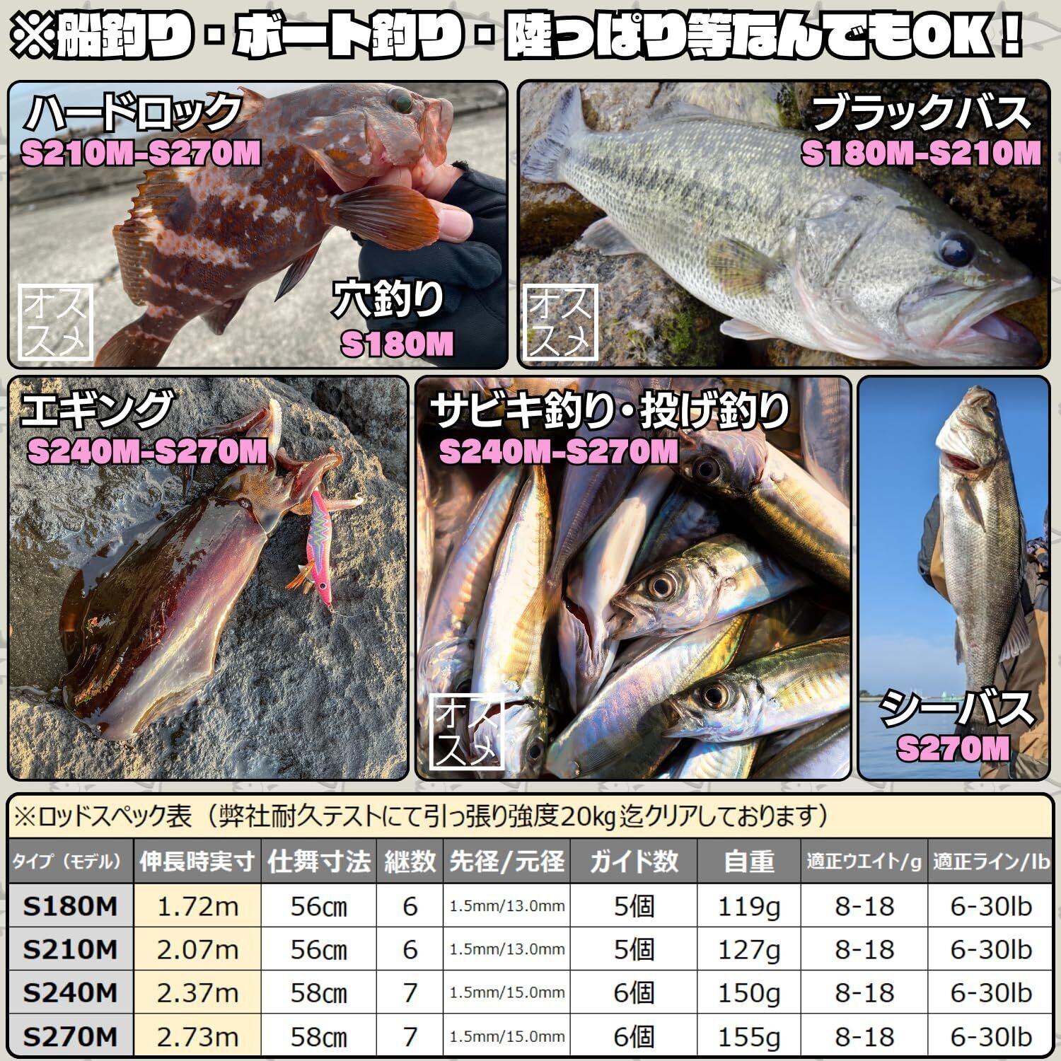 【商品仕様】詳細は商品ページのロッドスペック表をご確認くださいませ。(S180M:全長172㎝、5.6ft、自重119g、継数6本、仕舞寸法56㎝、適正ルアーウエイト8g~18g)(S210M:207cm、6.8ft、自重127g、継数6本、仕舞寸法56㎝、適正ルアーウエイト8g~18g)(S240M:全長237㎝、7.8ft、自重150g、継数7本、仕舞寸法58㎝、適正ルアーウエイト8g~18g)(S270M:全長273㎝、8.9ft、自重155g、継数7本、仕舞寸法58㎝、適正ルアーウエイト8g~18g)