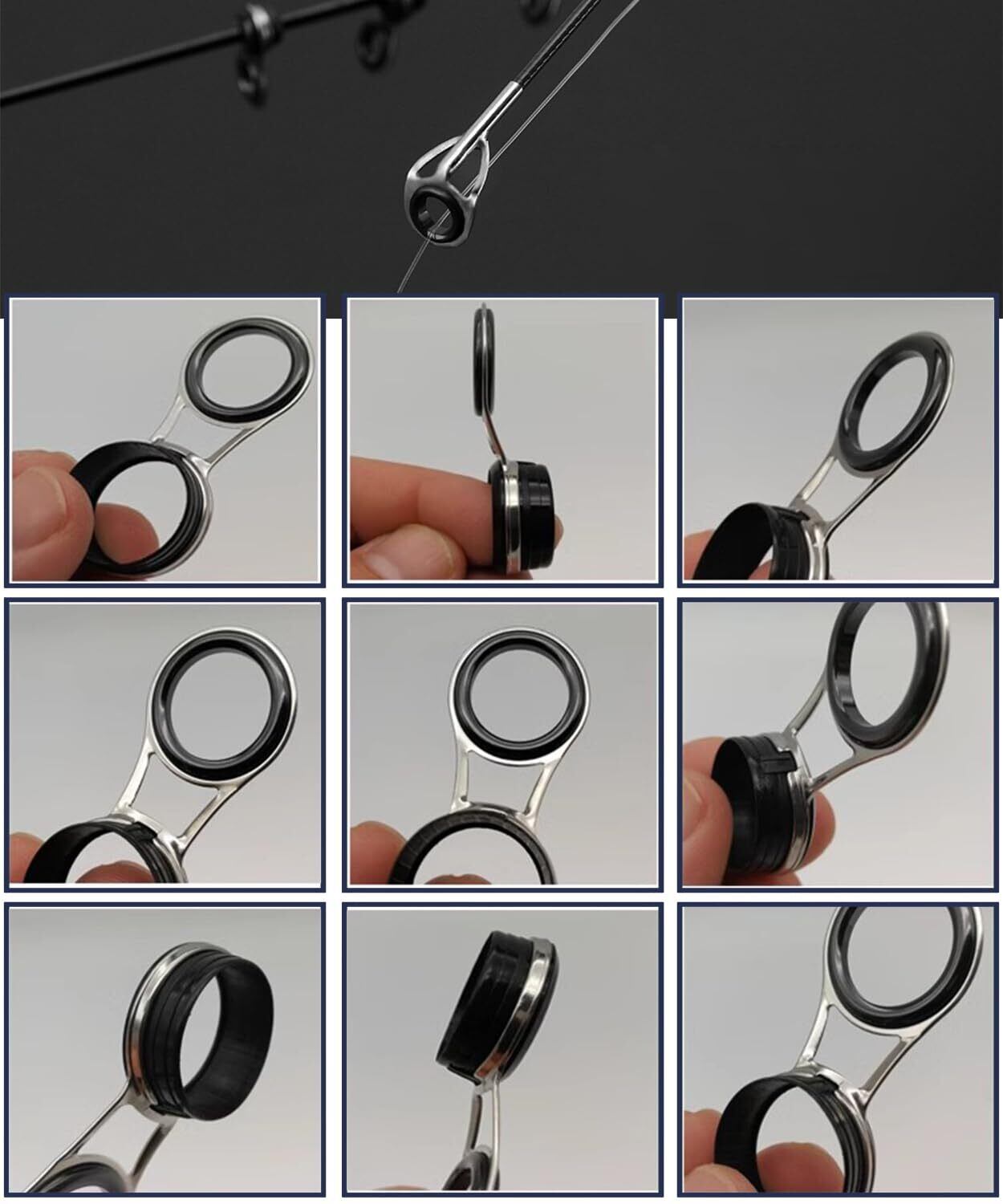 さまざまなモデルの製品が25個入りで、ラインリングアイの直径サイズ:3.0mm(取付穴の直径:2/3/4/5/6/7 / 8mm);4.0mm(取付穴の直径:5/6/7/8/9/10 / 11mm/12mm/14mm/15mm)トップリングガイドアイを3個プレゼント。磯遠投竿、磯上物竿、振出、船小物、メバルなどルアーフィッシングのライトゲームなどに使われています。さまざまなリング径の要求を満たし、さまざまなタイプのロッドの修理が可能です。