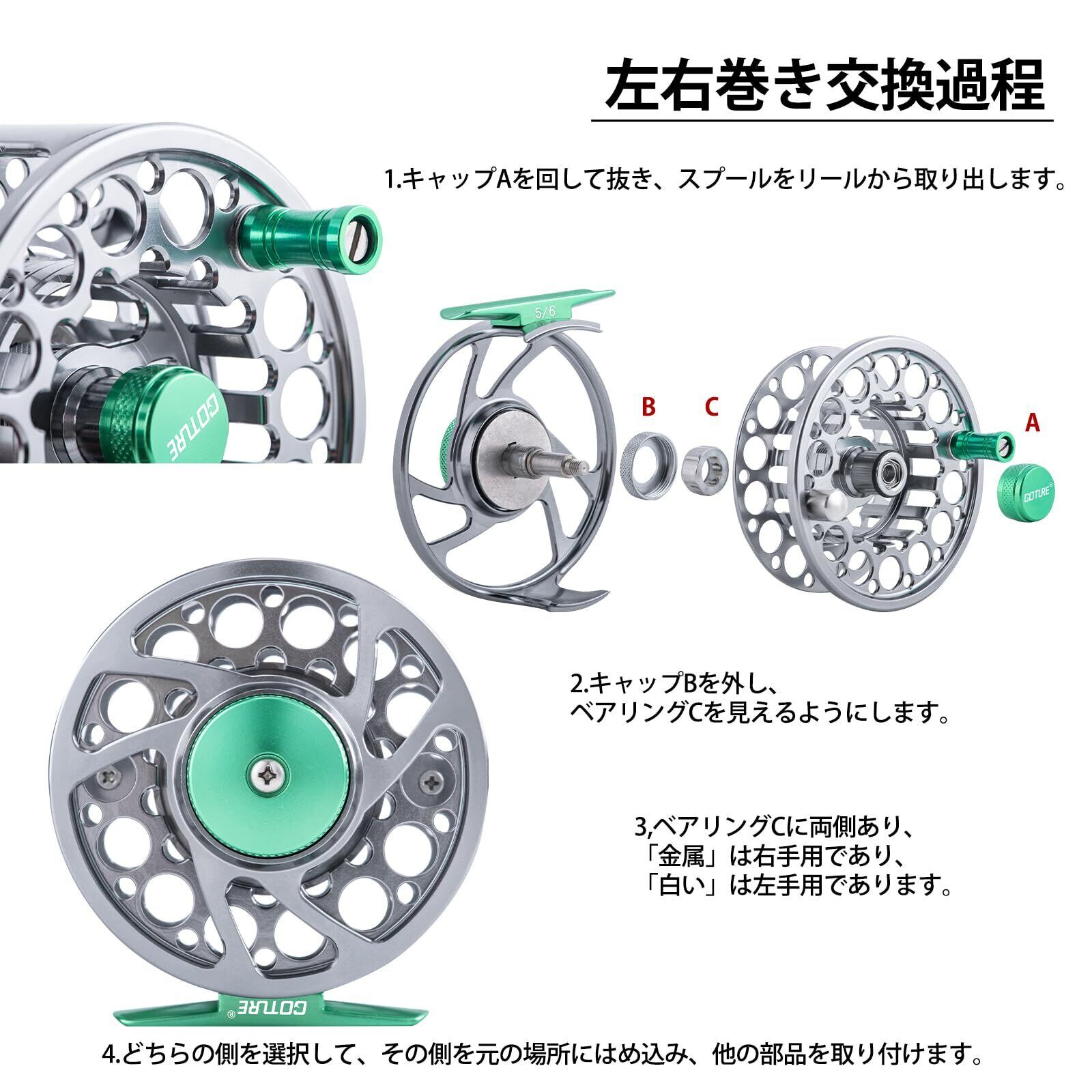 GOTURE フライフィッシングリール CNC 加工 タイコリール ガンメタル+濃緑色 5/6 左手用のフィッシングリール メインライン薄緑 WF-5F (100FT)+リーダーライン 4X (9FT)+エクステンションライン オレンジ 20LB (64M) セット左右交換可能 軽量