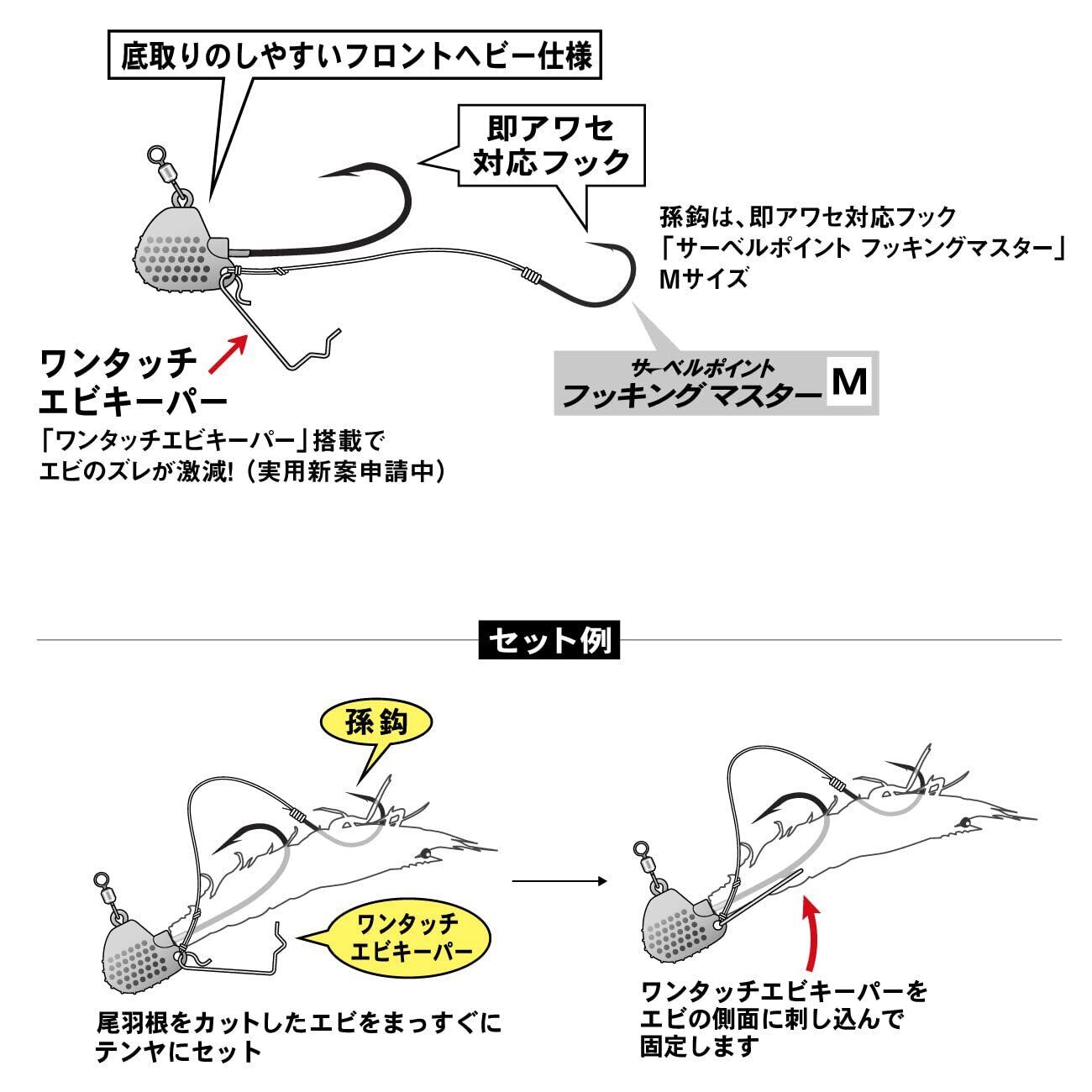ヘッドに高比重タングステンを採用した「桜幻 鯛テンヤTG」が登場! 高比重タングステンの採用と重心位置の徹底検証により急速フォールを実現。着底時にはテンヤ底面に設けられた「ボトムタッチバンパー」によりボトムでの接地面積を減らし、クリアな着底感を実現。ヘッド側面のディンプル加工は、凹凸による明暗効果と誘いの際の高いフラッシング効果により広範囲の真鯛を魅了します。親鈎は度重なる実釣により導き出した、即アワセに最適な鈎先角度「ゼロアングル」を採用し、コンタクト性を重視した孫鈎と相まってフッキング率を実現します。さらに、エビをしっかり固定でき、素早く脱着可能な「ワンタッチエビキーパー」の採用によりエビのズレを防止することで手返しの良い釣りを展開できます。
