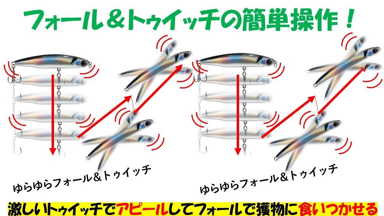 巻く事(リトリーブ)を止めるたびにユラユラと沈んでいく動作が、弱った小魚(ベイトフィッシュ)をリアルに再現し、獲物の捕食本能を刺激します。 また、垂直に沈んでいく特性上、障害物の隙間や奥にいる魚にアプローチしやすく、沈下中にアタックされることが非常に多いです。