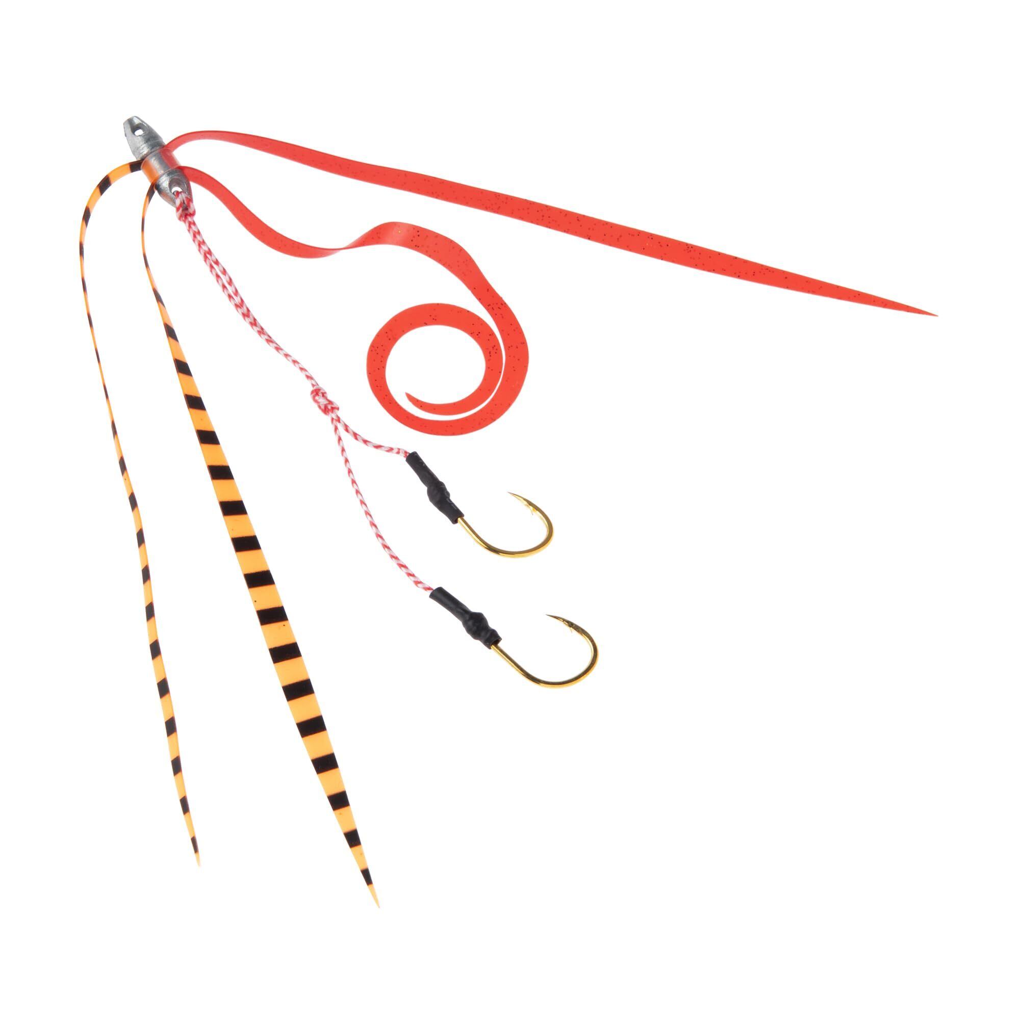 【針の特徴】 小型金メッキフックで鋭くフッキング PE結束部分をラバーでガード。根ずれや歯に強い 計算された高さの違うフックポジションがショートバイトをフッキングに導く 【スカートの特徴】 細身仕様で喰いが渋い時にも効果絶大 カーリーテールがスパイラルな動きでバイトを誘発 リアクションバイトを発生させやすい波動を生み出す