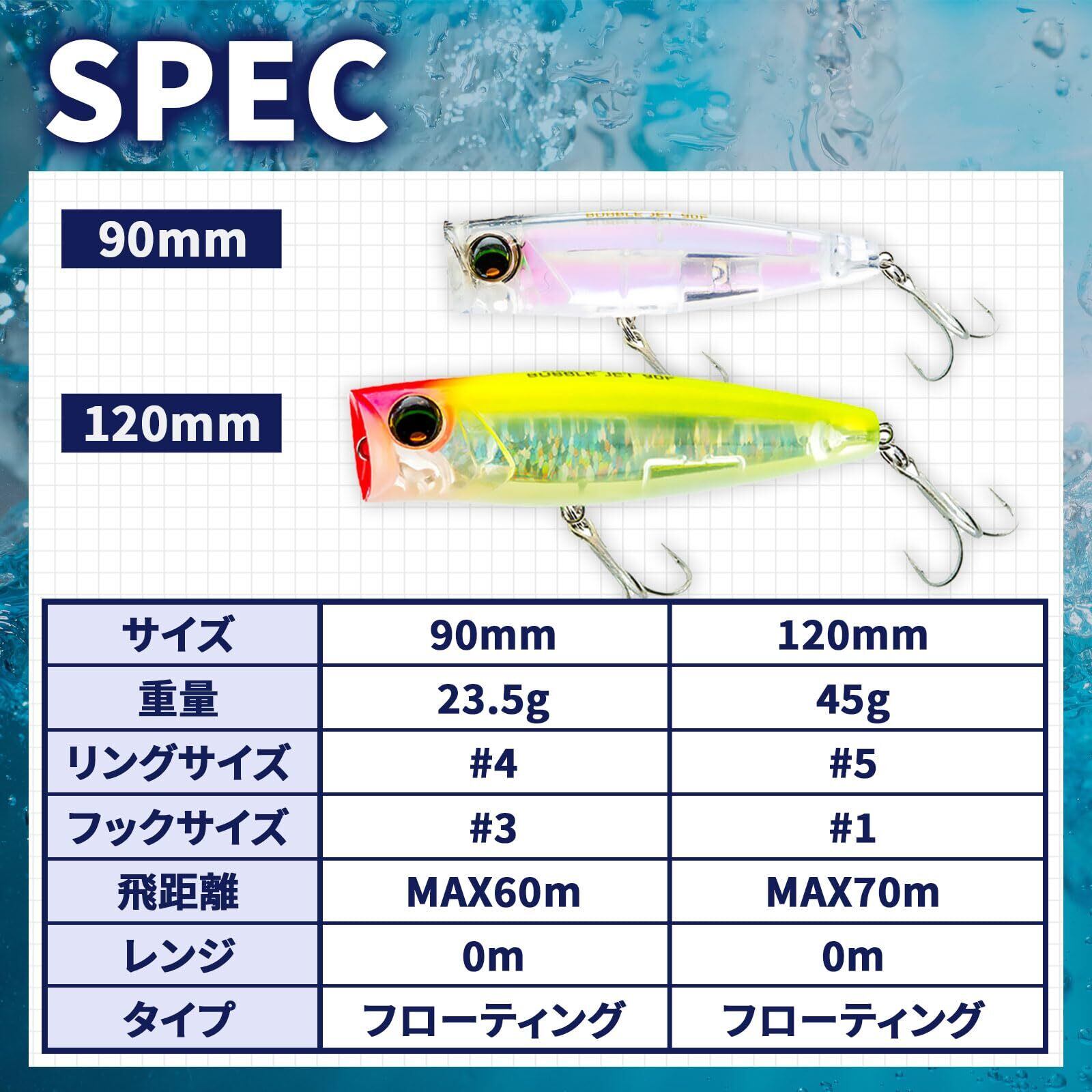 ◆バランスが取れた重心設計により抜群の遠投性能と操作性を両立。◆ポッピングによる図太いサウンドとスプラッシュ、さらに連続したバブルを発生させ深場にいる魚にもしっかりアピール。◆高強度の肉厚ボディで小型~中型青物狙いにも大活躍。