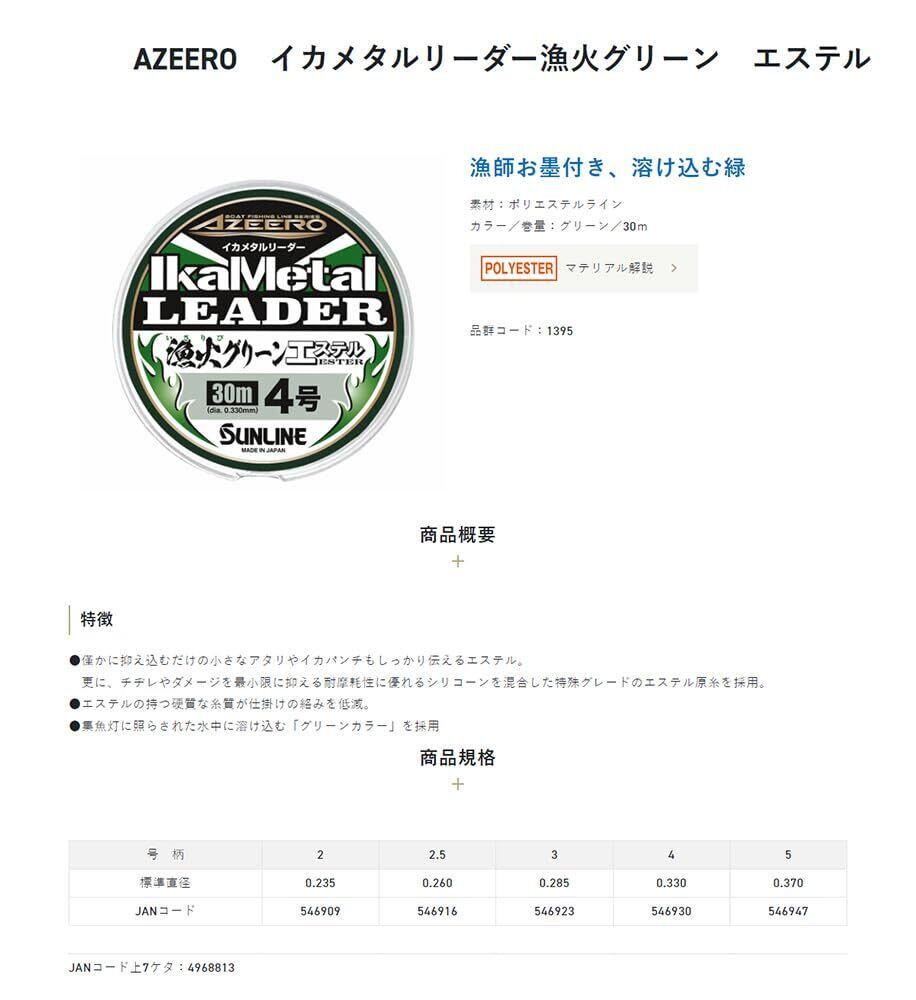 コンセプト:【イカメタルリーダー 漁火グリーン】……集魚灯(漁火)に照らされた光と同じカラーである「漁火グリーン」は光に色が馴染み周囲の環境に溶け込む!! ターゲットに警戒心を与えにくい超高感度シリコーン入りエステルライン!!
