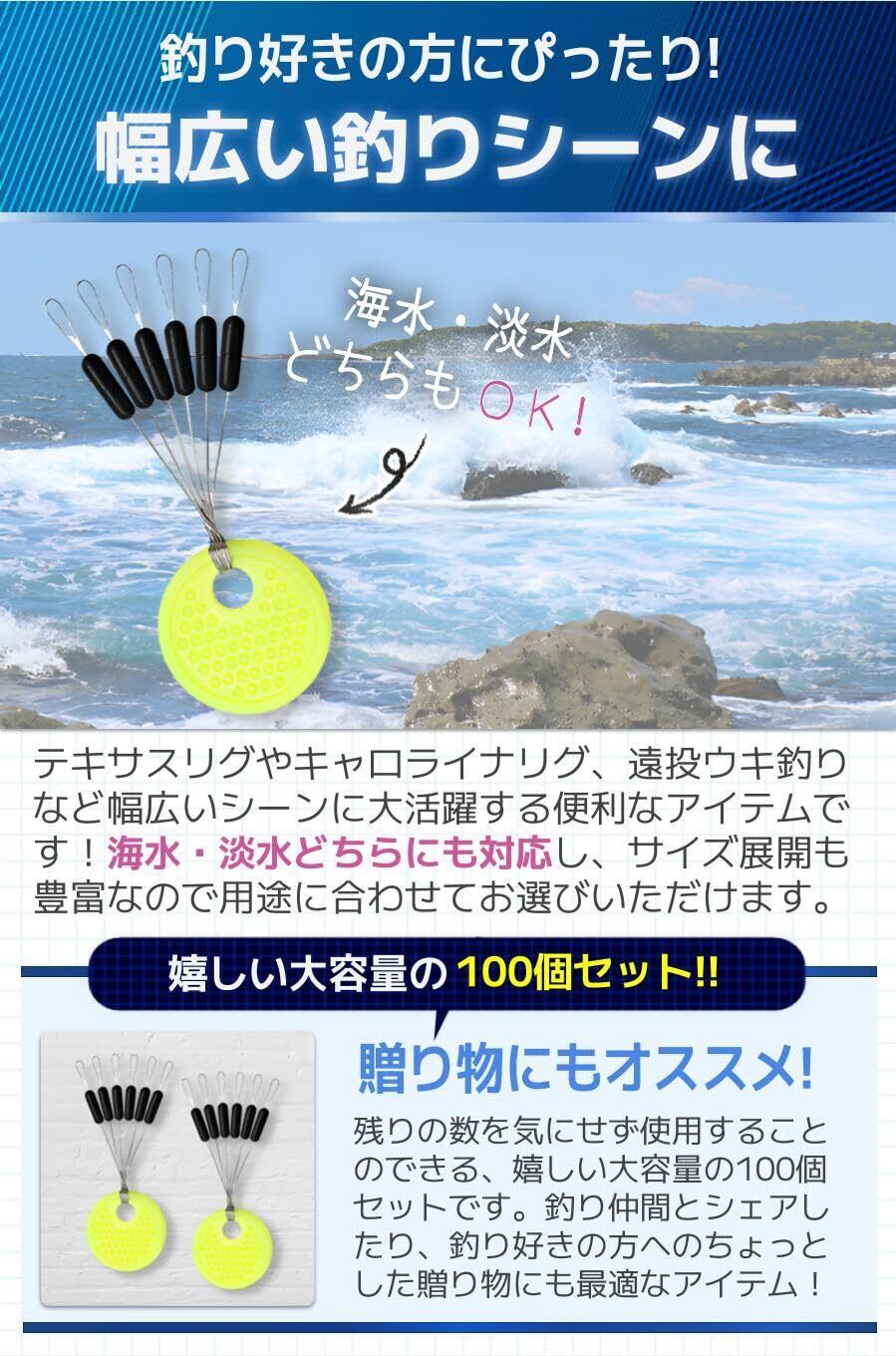 【商品特徴】①繰り返し使用可能:高耐久素材で劣化がしにくく長寿命!/②海水・淡水に対応:幅広い釣りの場面に大活躍!/③スムーズな取り付け:手軽に取り付けられてすぐに使える/④実用的な大容量セット:釣り好きの方に嬉しい大容量