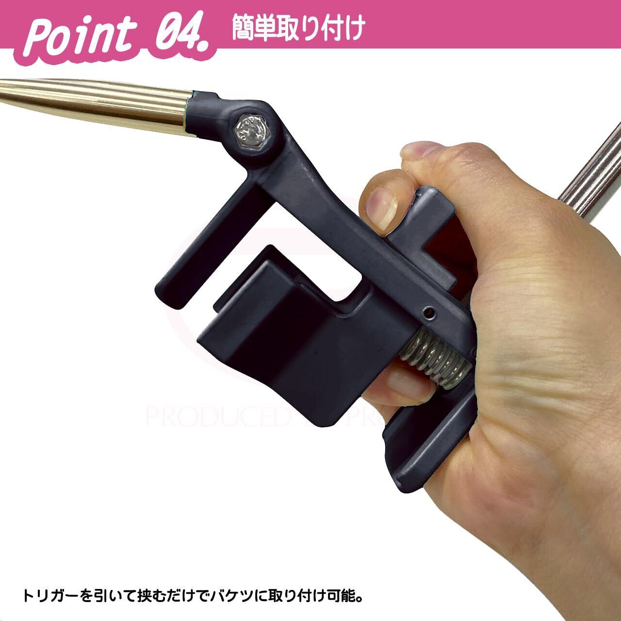 バケツの平面・コーナー・丸型にも対応し、トリガーを引くだけで13mmまでの水槽・バケツに簡単装着可能と取付位置も自由自在。