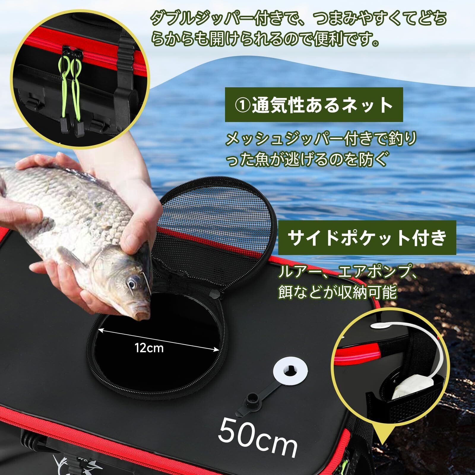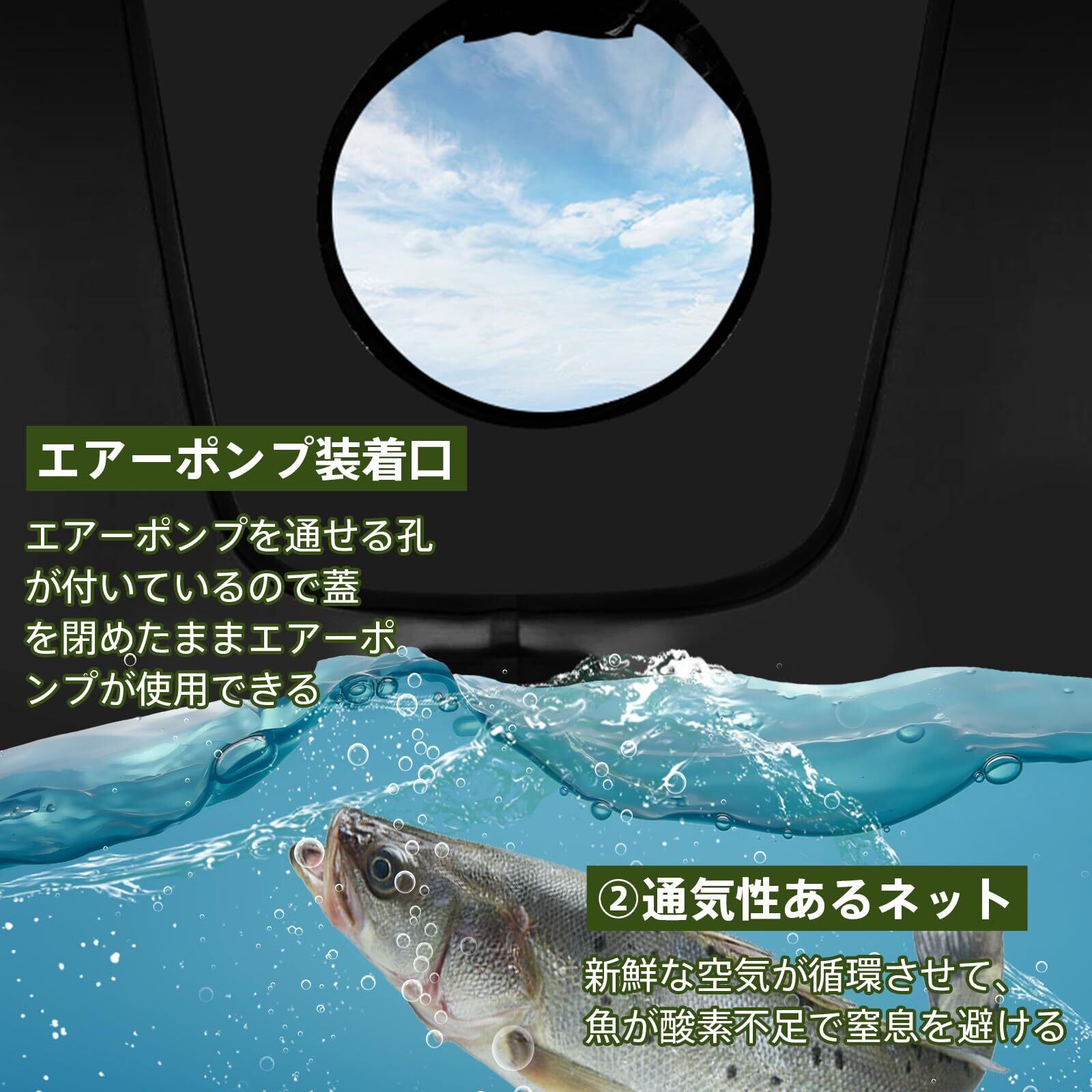 【通気性があるネット】メッシュ状のフタはファスナー開閉により窓開け&全開が可能です。メッシュジッパー付きで釣った魚が飛び出すのを防ぎ、魚の投入がしやすいです。新鮮な空気が循環させて、魚をしばらく生き続けます。