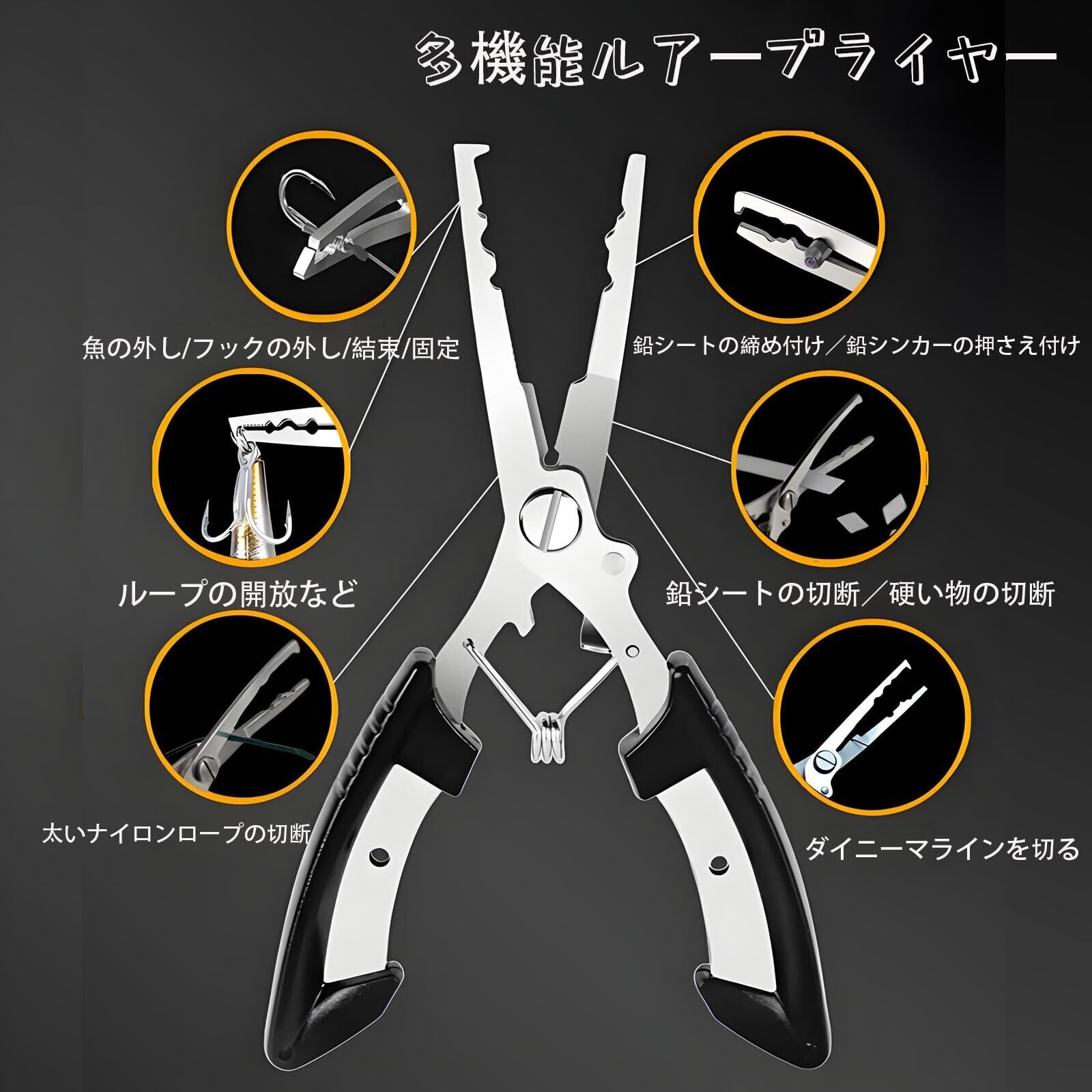 【高品質の素材】フィッシングプライヤー 耐久性のあるステンレススチール素材で作られており、錆びにくく、海水環境で長期間使用しても錆びません。海釣りやルアーフィッシングなど、高強度のシーンに適しています。使用後はきれいな水で洗い、乾燥した場所に保管することで、持続効果を最大限に高めることができます。