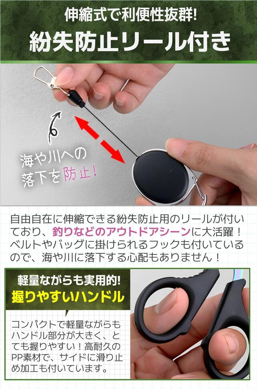 【紛失防止リール付き】自由自在に伸縮できる紛失防止用のリールが付いており、釣りなどのアウトドアシーンに大活躍!ベルトやバッグに掛けられるフックも付いているので、海や川に落下する心配もありません!
