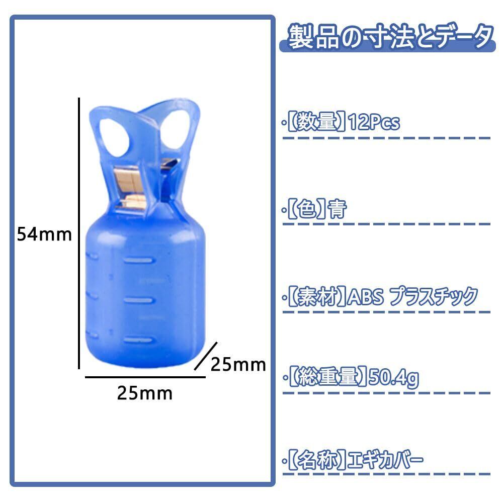 釣り針を守るエギカバーで、12 個入り(総重量 50.4g)、青色の ABS プラスチック製。イカ、ザリガニ、小魚、エビなどの対象魚にも使え、釣り針を落下や衝撃から守り、繰り返し使用可能。釣り愛好者に最適な小物で、釣り針の寿命を延ばします。
