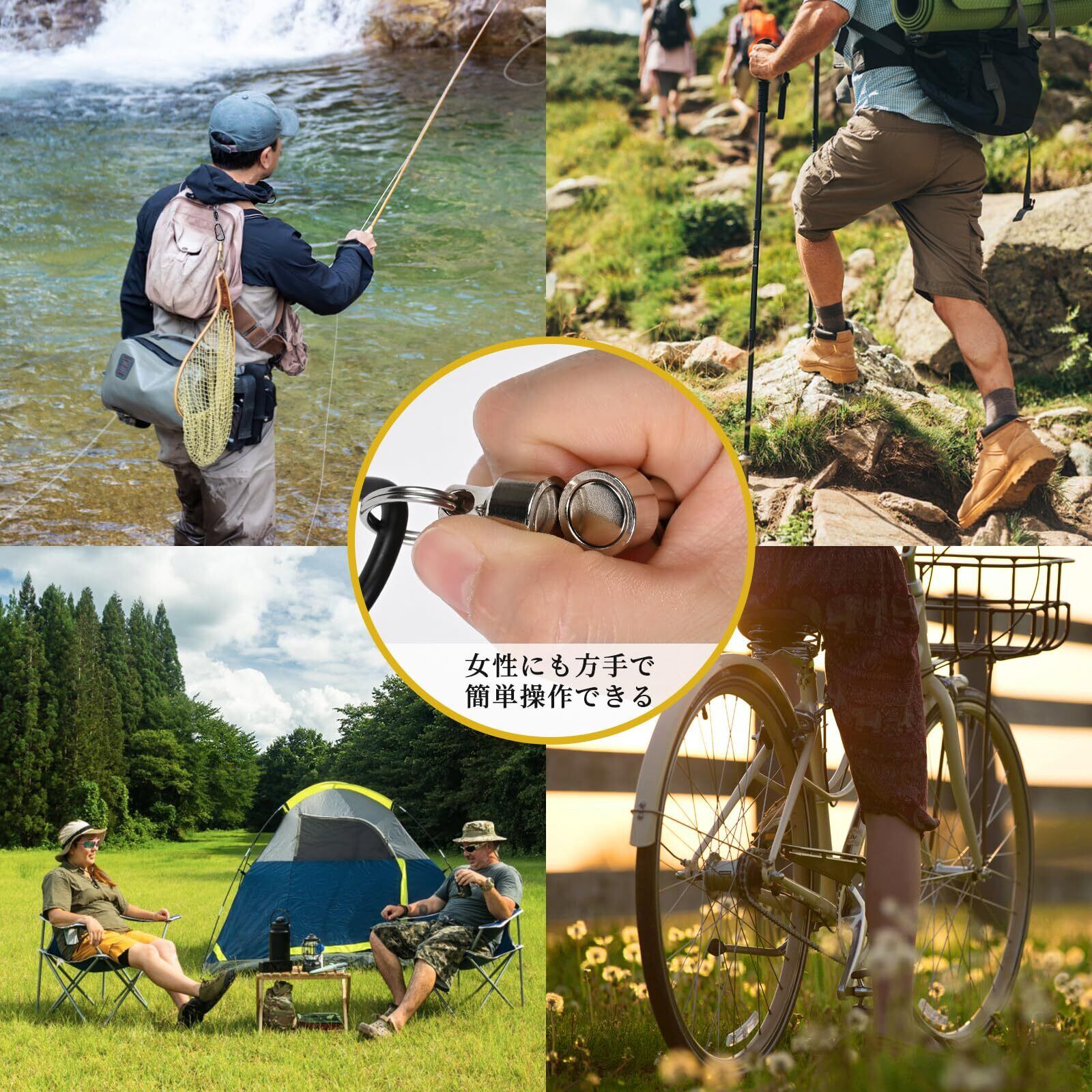 【軽量&コンパクト】:本体重量はわずか37g/48g(スプリングコード付き)。タープやテントに挟んで吊るしても負担にならず、携帯性にも優れています。フック部分はカラビナ仕様のため、風や地震の揺れでも落下の心配がありません。フィッシングベスト、ベルトループ、バッグなど、さまざまな場所に簡単に装着可能。さらにスプリングコード付きで、不意の落下や紛失を防ぎます。