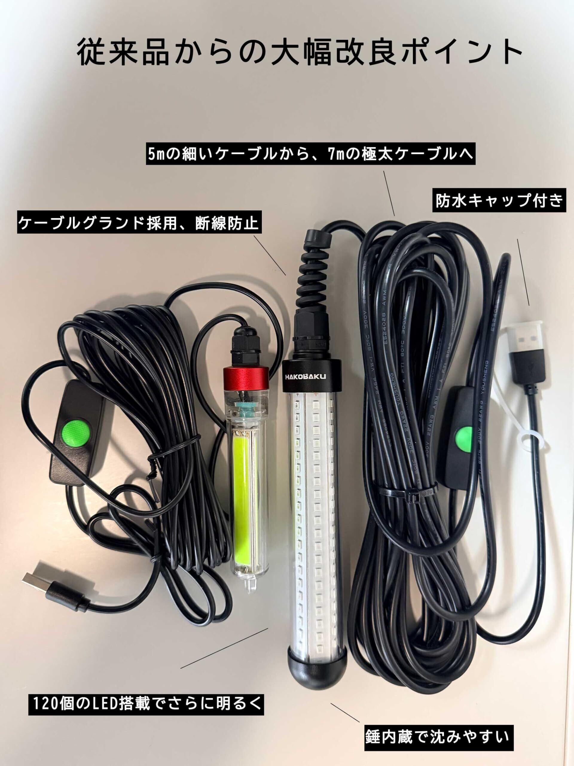 【用途】:アジ、イカ、タチウオの堤防釣りに最適な高輝度水中集魚灯。120個のLEDを搭載し、暗闇でも効果的に魚を引き寄せ、釣果アップに貢献します。