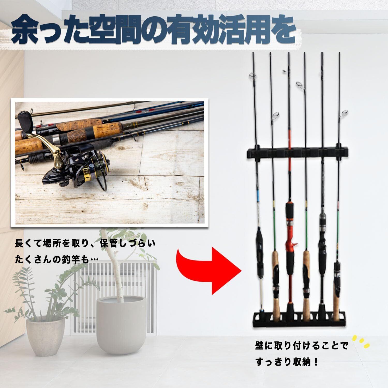 【スペースを有効活用】釣り竿の収納に困っている場合でも、この壁掛けホルダーはスペースを効果的に活用します。釣り道具を整理整頓し、部屋を広々と使えます。