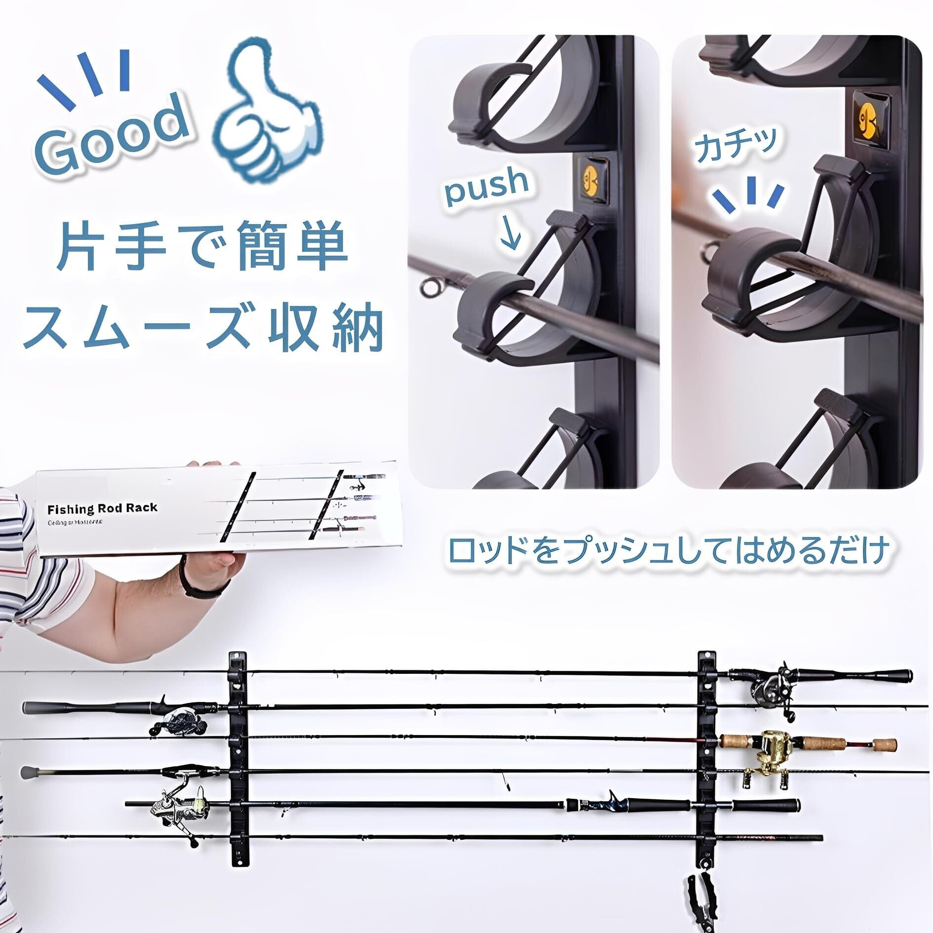 クリップ式 多機能フィッシングロッドホルダー:壁掛け・デッキ設置対応で、大切な釣り竿をしっかり保護 設置場所の自由度が高い:最大3本または6本の釣り竿を収納でき、壁や天井だけでなく、ガレージ、ボート、トラックデッキ、トラックの荷台など、釣りスタイルに合わせて自由に設置でき、様々な場所に設置可能です。 簡単な出し入れ、片手操作: 独自の設計により、釣り竿のハンドル側から片手で簡単にロッドを出し入れできます。手間取ることなく、スムーズに準備や片付けが行えます。 確かなホールド力と振動からの保護: ロッドをプッシュして動かすだけで簡単スムーズに収納でき、クリップでしっかりと固定します。付属のOリングを併用することで、振動からロッドをしっかりとキープし、大切な釣り竿の安定性を高めます。 あらゆる環境に対応する耐久性: Oリングは特殊ゴム製で、屋外でも高い耐久性を誇ります。晴れ、雷雨、強風、雨、雪など、あらゆる天候条件下での使用に適しています。 硬く、出し入れが困難で、変形しやすいといった問題を解決し、簡単に出し入れでき、片手で操作可能、そして頑丈なホールド力を提供します。 釣り竿の整理整頓と保護に最適な、機能性と耐久性を兼ね備えたこのロッドホルダーをぜひお試しください。 対応ロッド径:直径2cmまでの釣り竿を収納可能。 商品サイズ 3本収納 約7*5.5*19cm 6本収納 約10*4.8*42.5cm