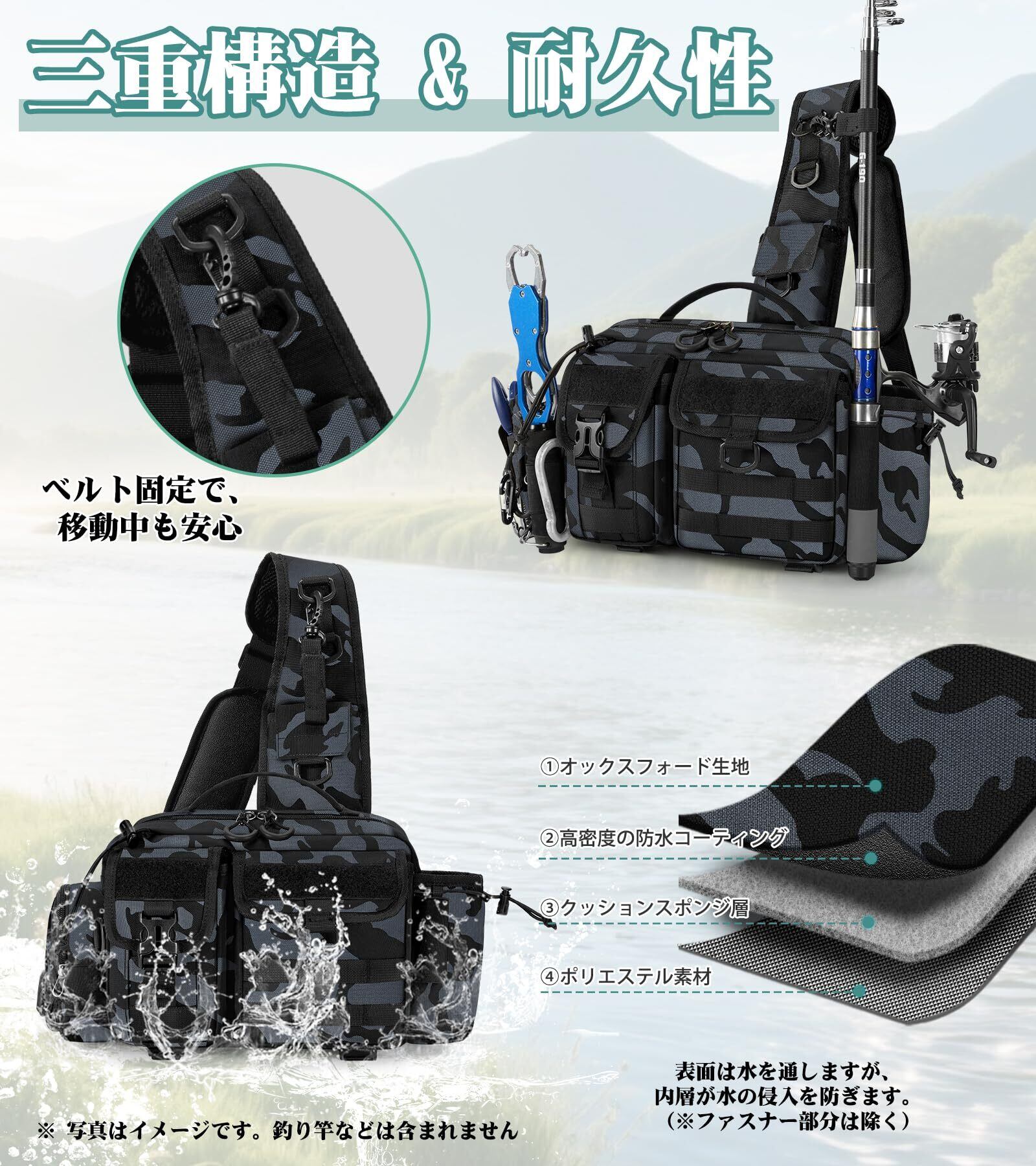 【日常の釣りに十分な耐水性と丈夫さ】釣り バッグは日常の釣りシーンで必要な耐水性と丈夫さを備えています。表面に撥水加工を施しているため、小雨や手洗い時の水しぶきなどをはじきやすくしています。※完全防水ではなく、長時間の浸水や豪雨にはご注意ください。悪天候が心配な日でも、釣り道具の保護に貢献できるよう設計されています。