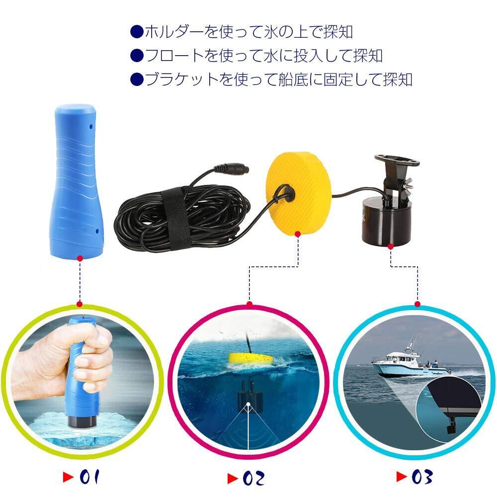 ぎょたん探知機99.9水深メートルまで探知できます。発信角度45°。カヤック、ボート、SUPに取り付け用振動子ブラケットが付き。魚群探知機振動子(ソナー)ケーブル7.8メートルがあるので、堤防からも利用できます。また、氷上ワカサギ釣り対応の振動子ホルダーが付きます。