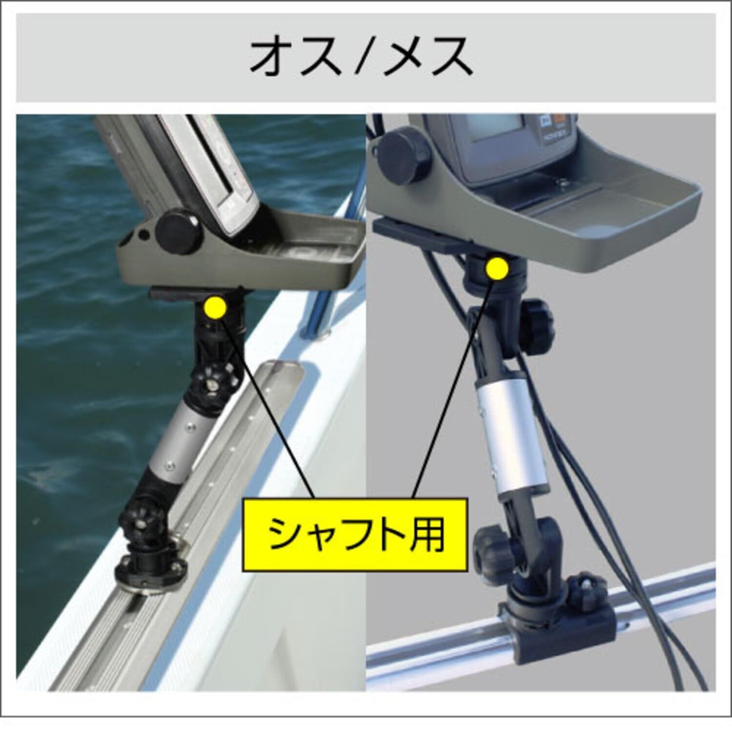 ロッドホルダーの位置を高くしたり、魚探マウントを手前に伸ばしたりと用途は多種多様です。片側がソケット(メス)、もう片側がシャフト(オス)になっていますので、お好みのアタッチメントを取り付け可能です。