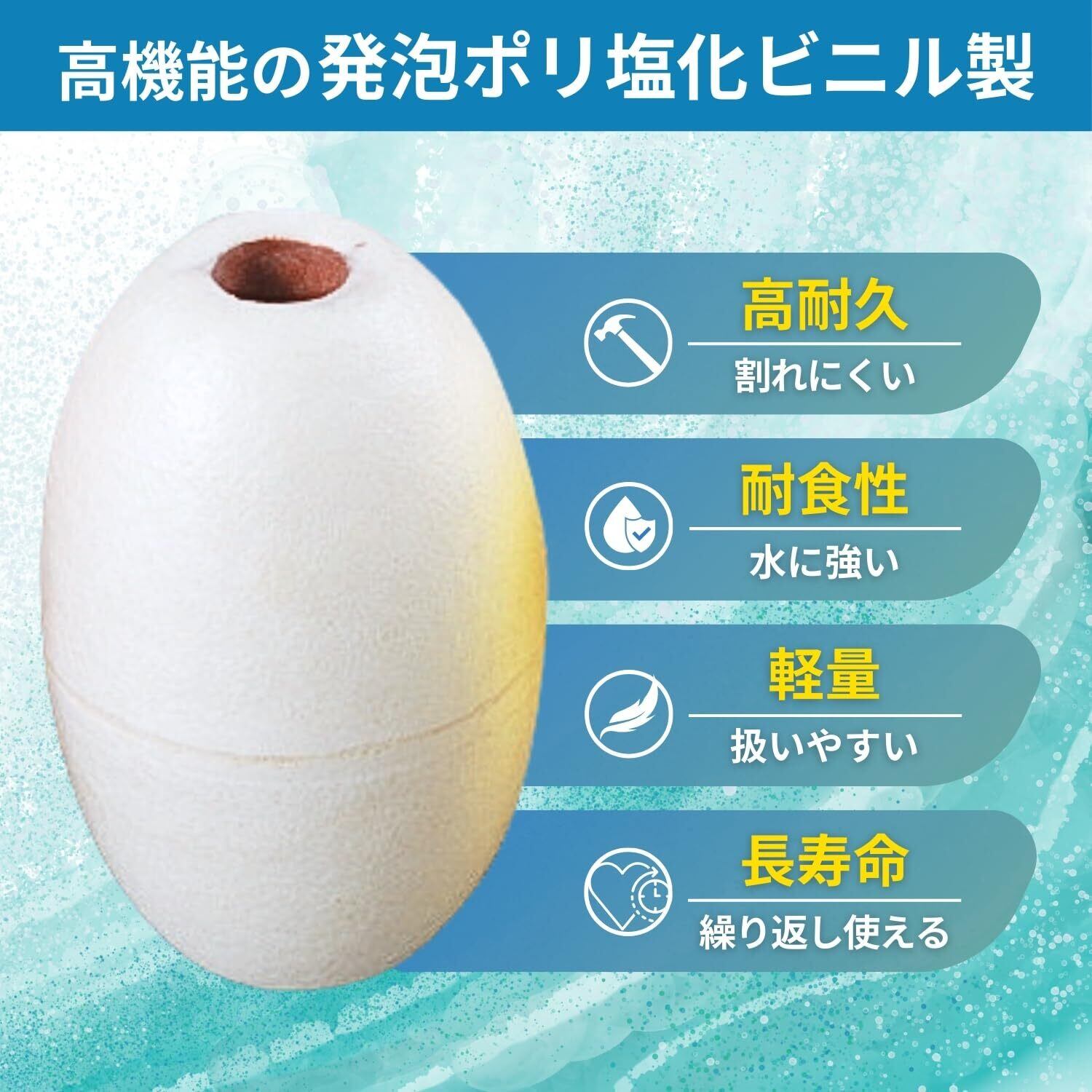 【耐久性と安全性を兼ね備えた高品質PVC素材】 厳しい海水・紫外線・潮風などの環境下でも劣化しにくい高耐久PVC製。浮力を安定して維持し、長期間安心して使用できます。水に浮く性能と丈夫さで、釣具や漁具を確実にサポートし、海中への落下や紛失を防止します。 【視認性と取り扱いやすさ】 白色の視認性の高いフロートは、ボート上や海中でも目立ち、作業効率を向上。中通し穴(内径18mm)付きで、アンカーロープや係船ロープへの取り付けも簡単。ブイや浮子としてもすぐに活用できます。