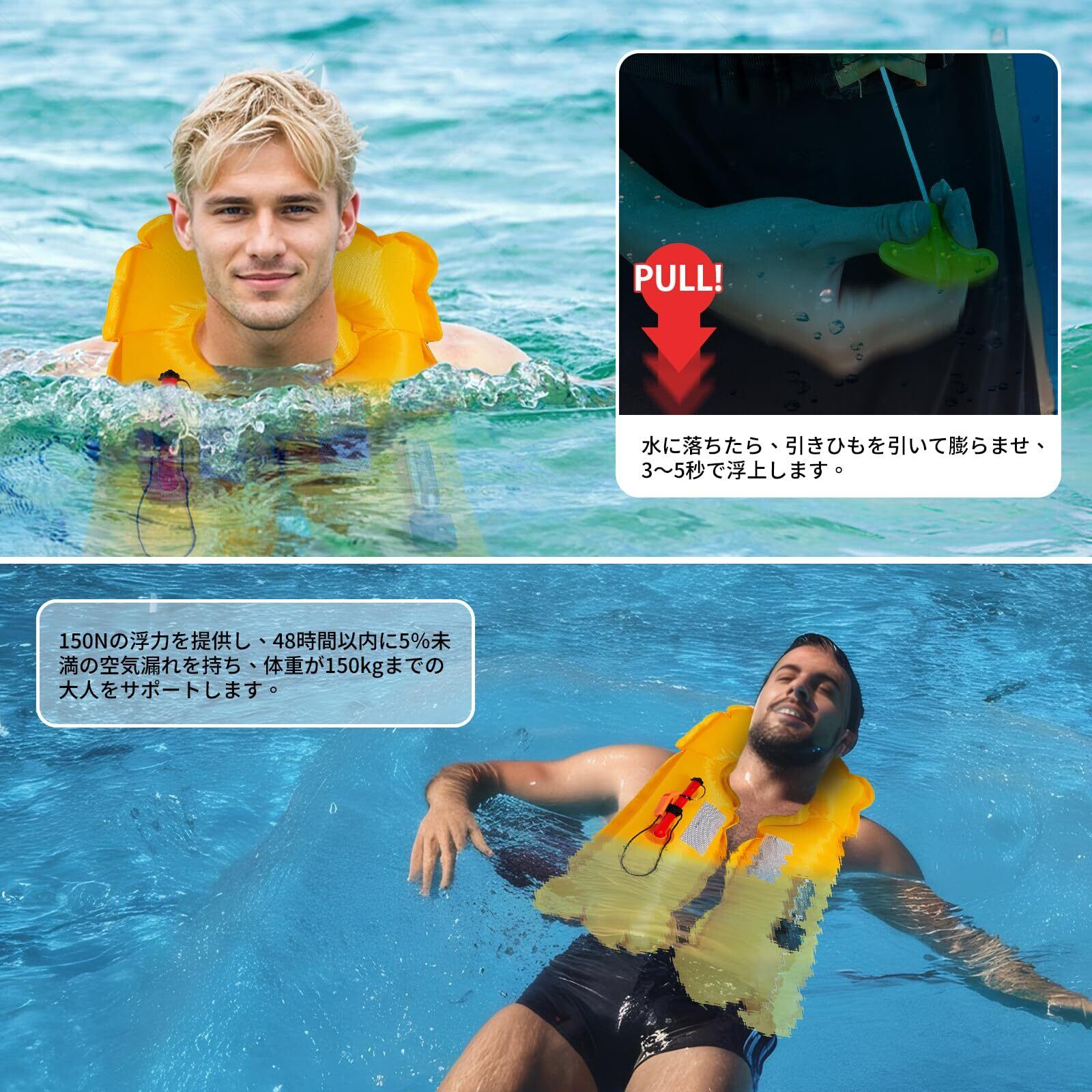 【手動充気式・迅速膨張】緊急時に簡単にロープを引くだけで3-5秒で迅速に膨張します,水面に浮かびます。ライフジャケット 手動膨張式は意外な雨や波しぶきに濡れても誤って作動しません。充気前に繰り返し使用可能で、水上活動に支障をきたしません。