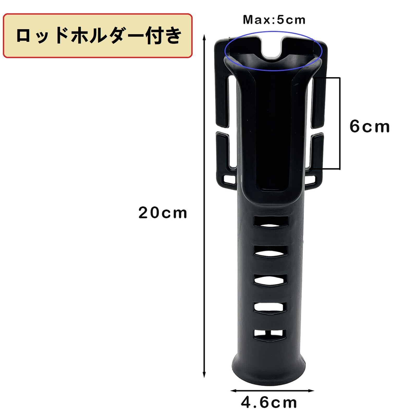 ロッドホルダー付き:長さ20cmのロッドホルダーが付属しており、釣り竿を一時的にホールドできるため、両手を使いたいときや、ちょっとした休憩の際に役立ちます。これにより、釣り場での作業がスムーズになり、釣りの効率がアップします。適用ロッドグリップ最大直径は1.38 "/3.5cmです。
