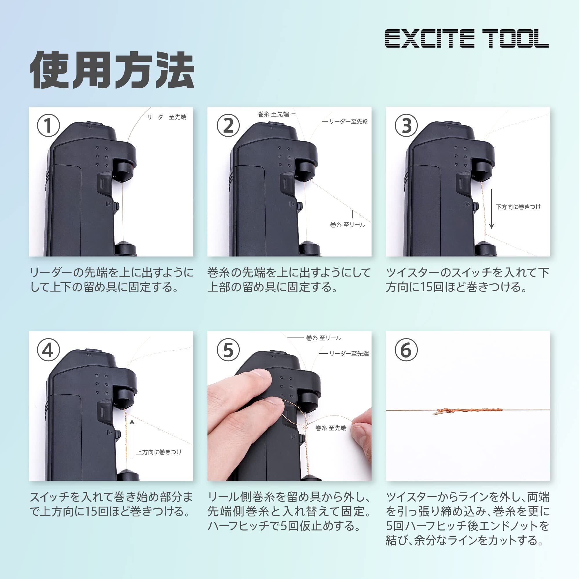 EXCITETOOL ラインツイスター 半自動 簡単 MIDノットライン結び機 釣り 電池式 フィッシング用品 軽量 持ち運び便利 リーダークリップ/取扱説明書/ハードケース付き