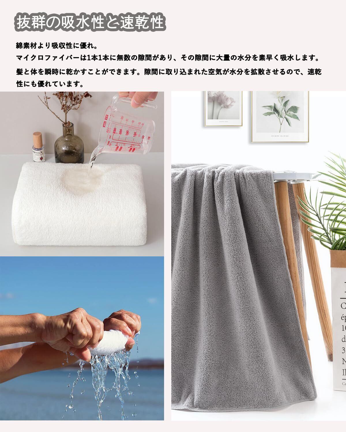 【抜群の吸水性と速乾性】綿の素材より吸水性が優れます。マイクロファイバー素材の表面は数えられない隙間があり、その隙間に大量の水分を素早い吸水できます。髪や肌にそっと当てるだけで水分が吸収される素材であり、また汚れも落としやすい特徴があります。隙間に取り込まれた空気が水分を拡散させるので、速乾性のポイントで、バスタオルの雑菌を抑え、健康を保つことができます。