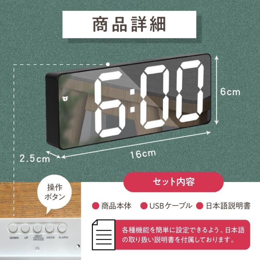 目覚まし時計 【3Mコード付き】 デジタル時計 置き時計 日本語説明書付き LED LED時計 卓上 おしゃれ 温度 タイマー 光る インテリア リビング 寝室 プレゼント (ブラック×ホワイト(黒面))