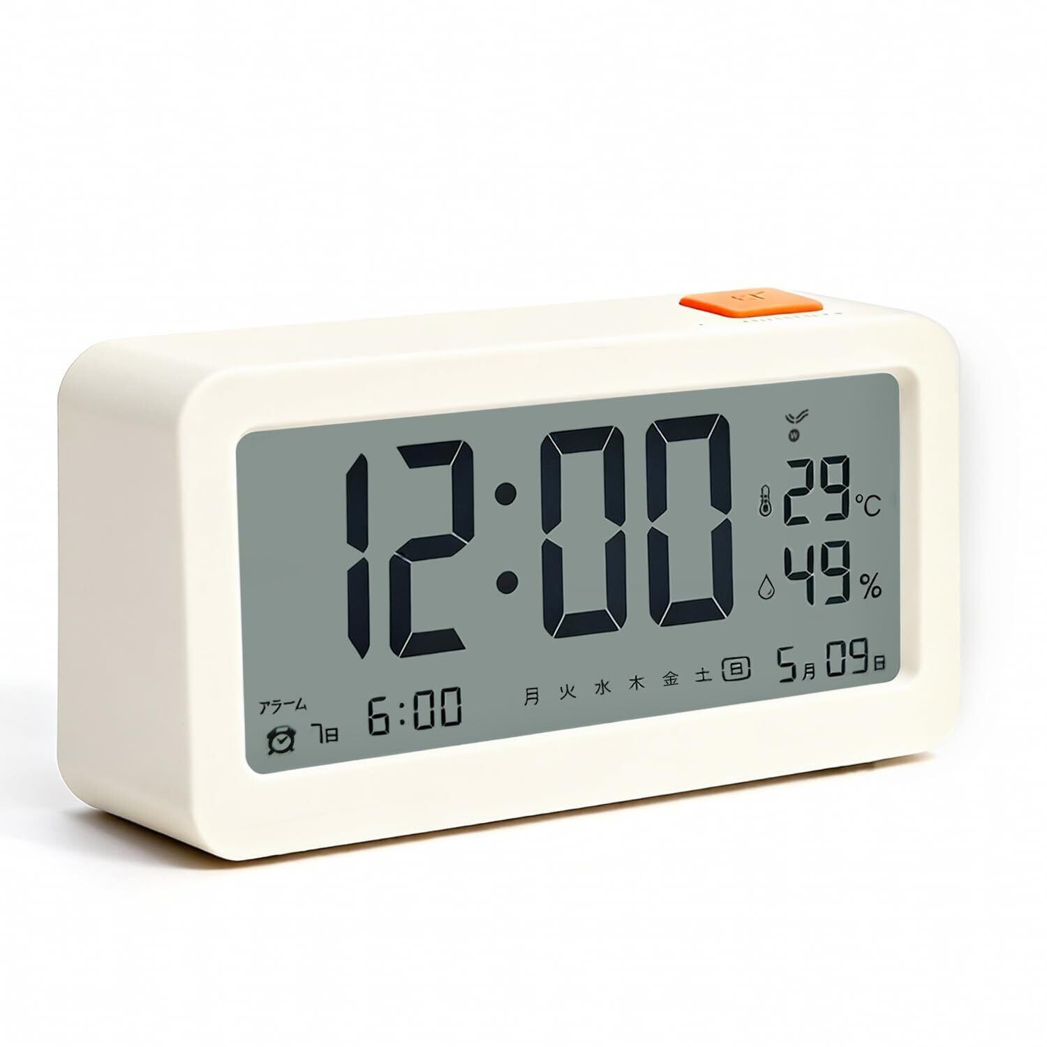 【多機能デジタル時計】高精細LCD画面に、時刻(12/24時間切替可)・日付(カレンダー)・曜日・アラーム・温度計・湿度計を同画面表示。静音設計で、スヌーズ機能も搭載。