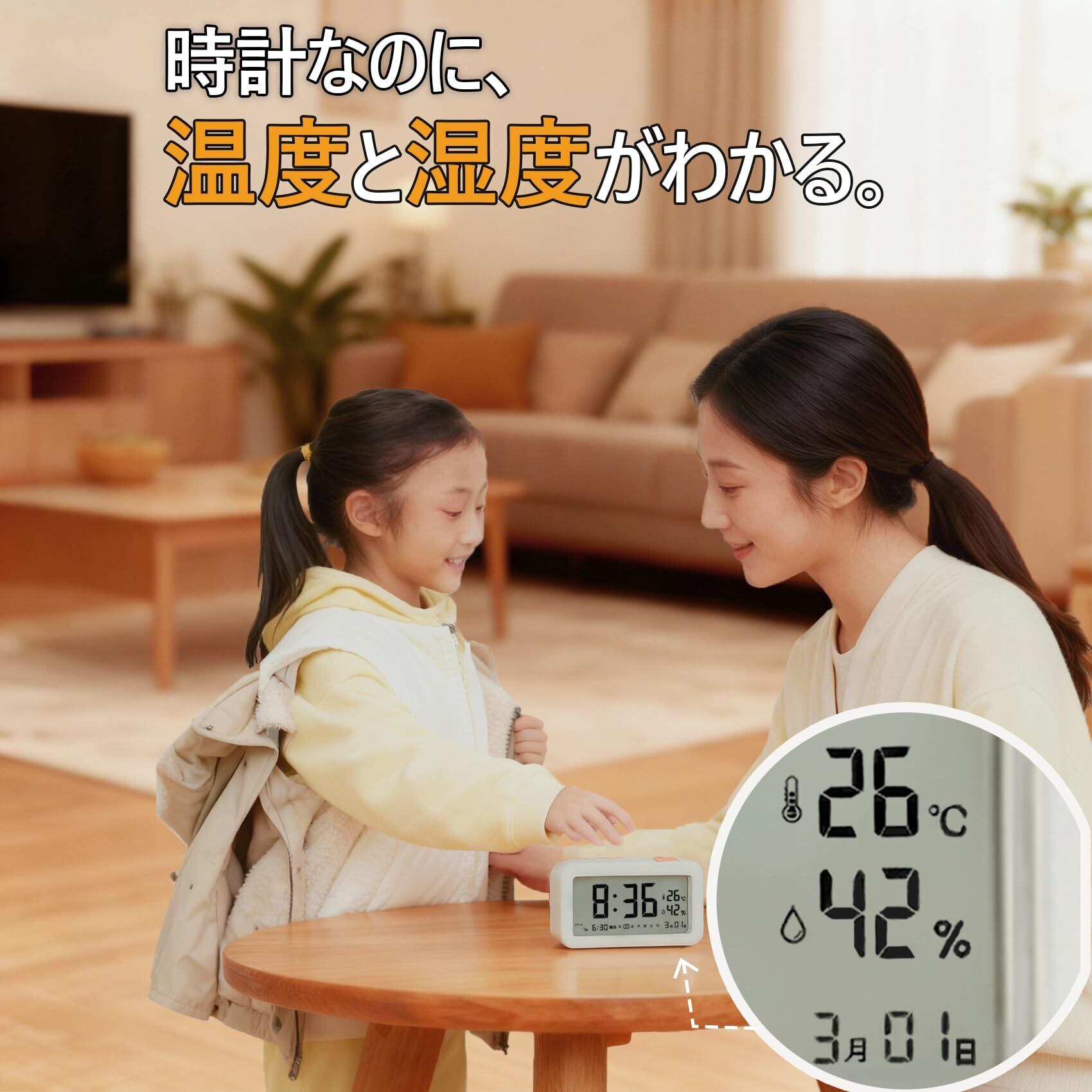 特徴 カレンダー表示, スヌーズ, 温度表示, 湿度表示, 目覚まし時計 電波