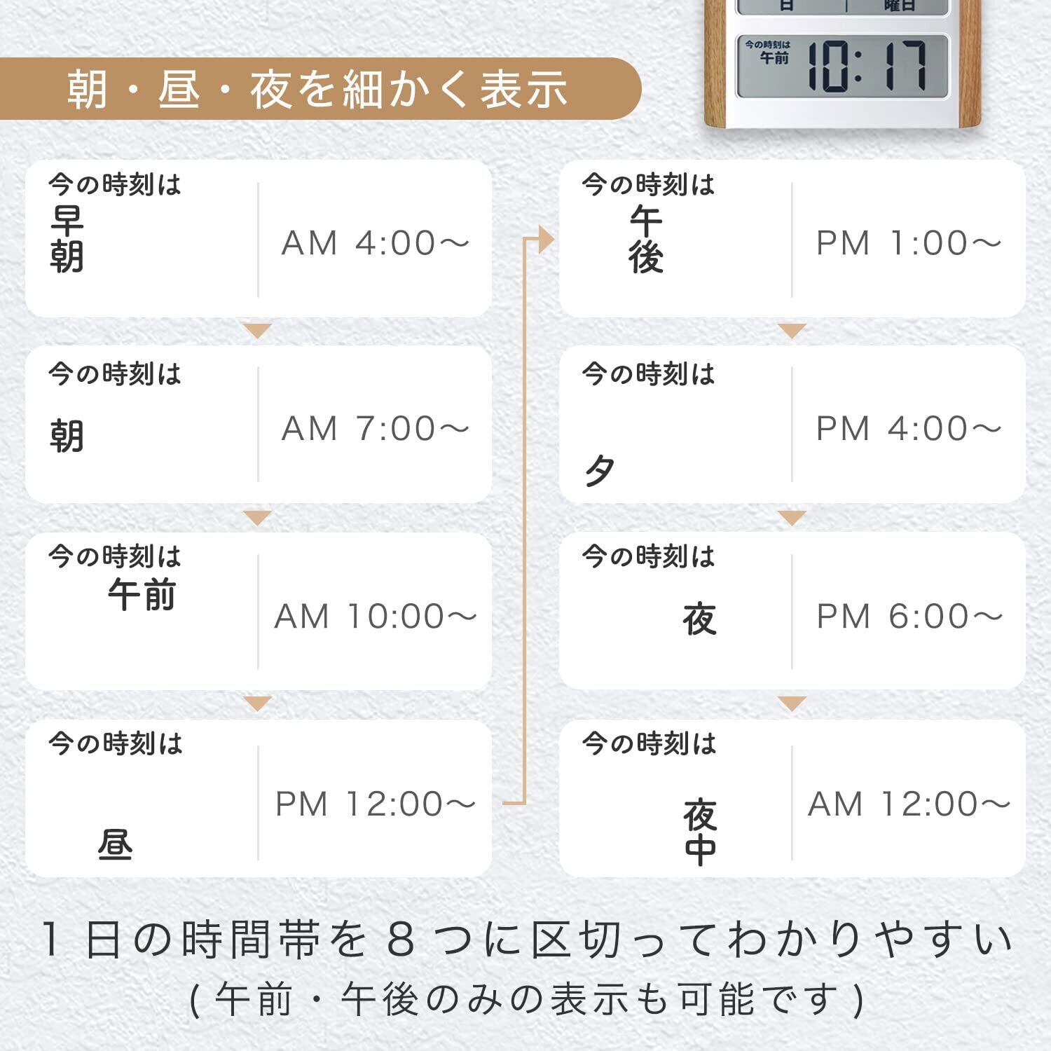 【時計表示のオンオフ切替が可能】ご使用者からの「情報が多いと混乱してしまうので時間表示を隠して使っている。」というご意見から、当モデルには時計表示のオンオフ機能が付いています。【ビッグサイズ】大きな画面で時刻、日付、曜日が見やすい!日付を忘れてしまう、家族に聞いてしまうなどのお悩みを解決。いつでも自分で確かめられるので安心して生活できるようになります。