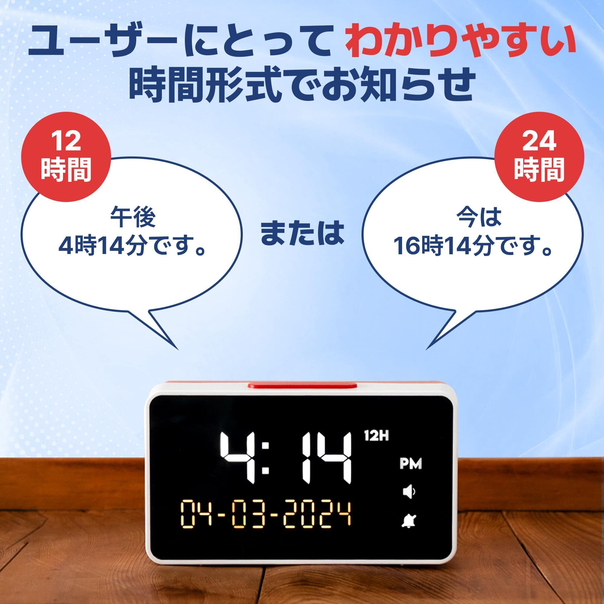視覚障害者・高齢者・認知症・難聴者向け しゃべる目覚まし時計|音量85dB|12時間・24時間表示|大きな数字・画面オフ機能対応