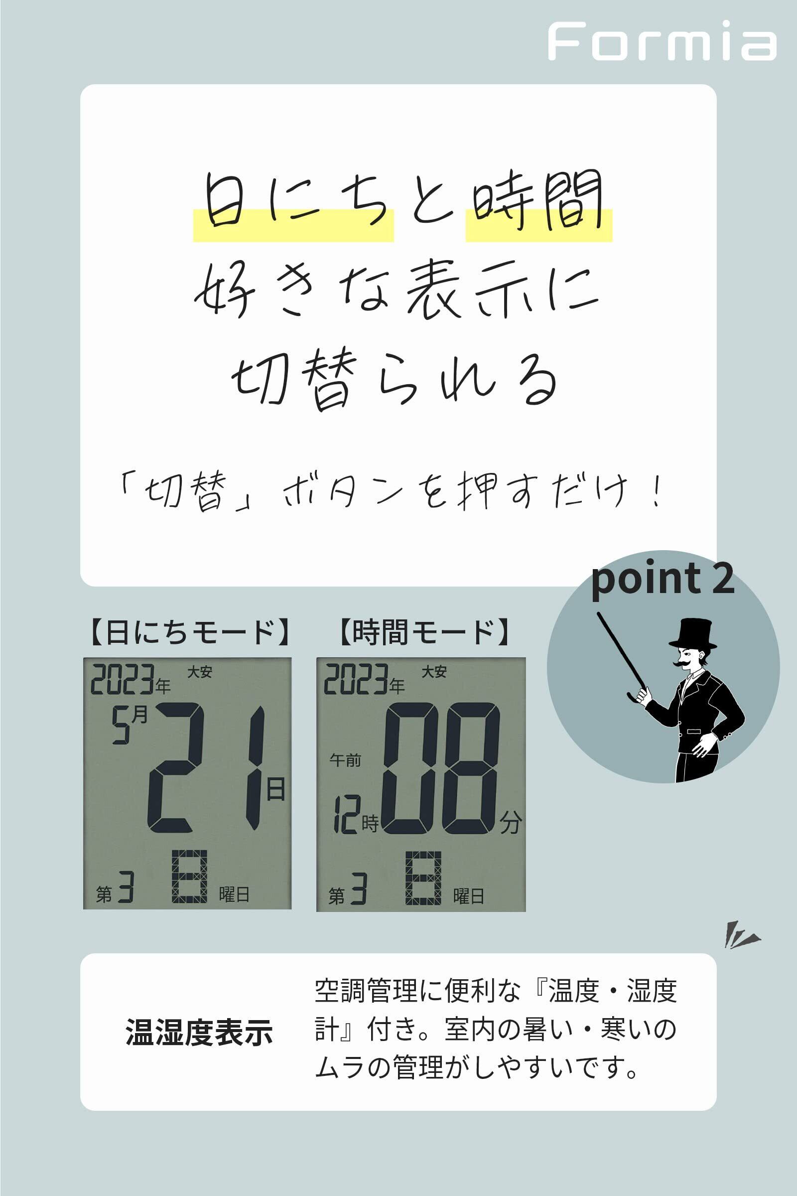 機能:電波受信機能 (自動受信/手動受信)、電子音アラーム、スヌーズ機能、六曜表示、温度表示、湿度表示、カレンダー表示、12/24時間制表示切替、表示切替機能 (日にちと時刻の表示位置が切り替わります)、置き掛け兼用