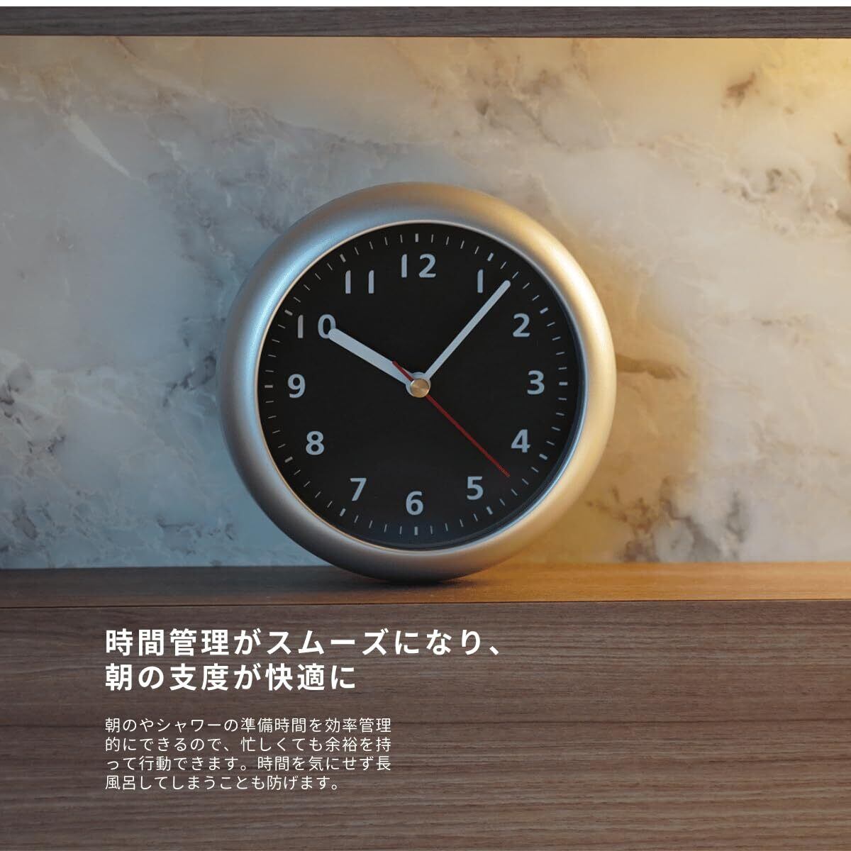 【防水設計】お風呂や洗面所の時計として使いやすい、防水パッキンで覆われた生活防水の時計です。