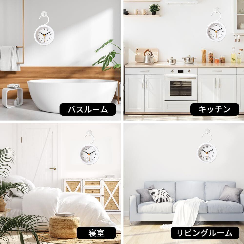 バスルーム時計防水壁掛けテーブル時計2 in 1フック付き壁掛けサイレントデザインバスルーム/キッチン/寝室/リビングルーム多機能時間ホーム (ホワイト)