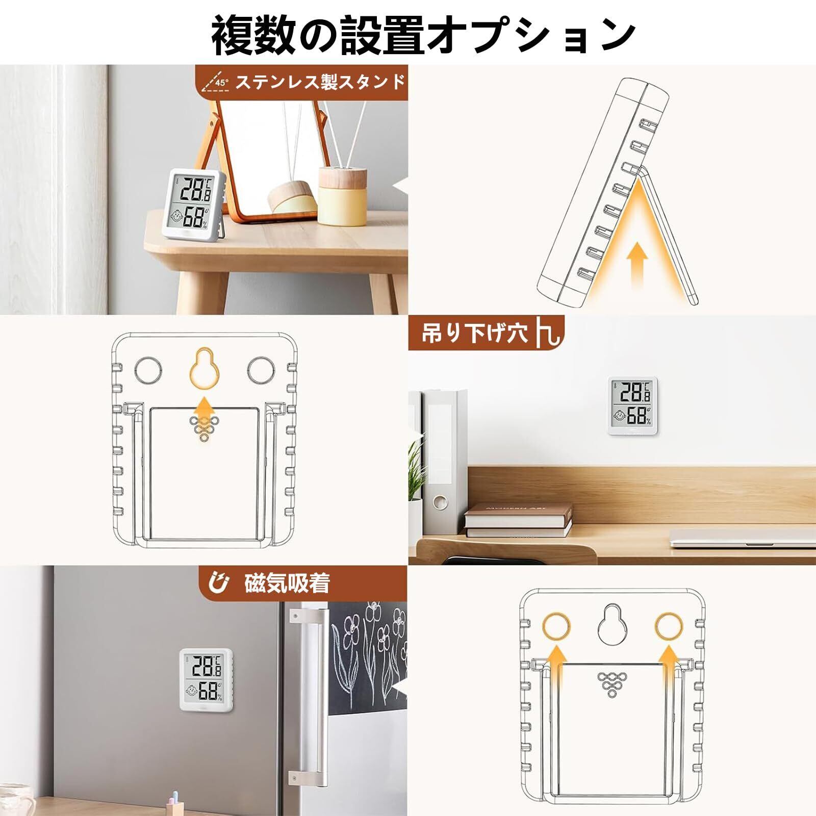 【3つの取り付け方法】: 折りたたみ式のスタンドを使って室温計を立てることも、背面の吊り下げ穴を使って壁に取り付けることもできます。また、内蔵のマグネットで金属面に取り付けることもできます。電源はCR2032(電池付属)。