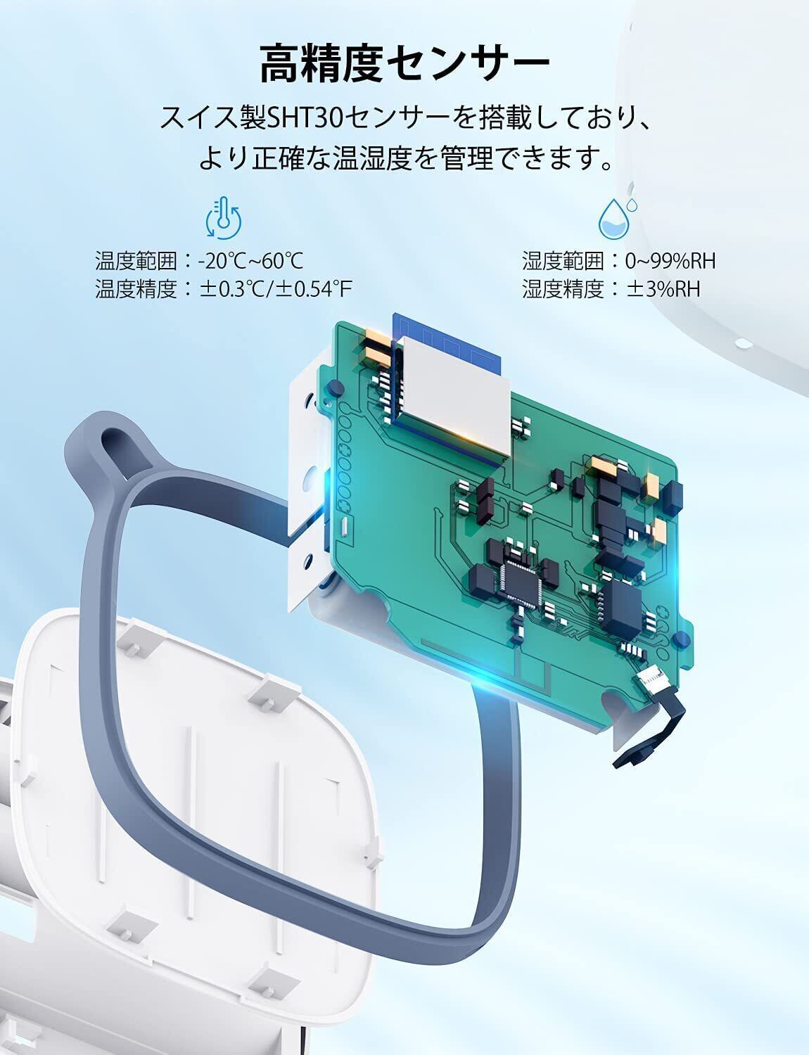 【高精度センサー】Govee WiFi温湿度計はスイス製温湿度センサーを搭載しており、高精度で信頼性の高い温湿度測定を実現し、より正 確な温度と湿度を管理できます。また、2秒ごとにデータを更新し、高い精度と感度を兼ね備えています(ご注 意:本製品は防水機能を備えておりません。使用温度範囲は-20℃~60℃です。湿気の多い環境、冷蔵庫内、または雨天時の屋外での使用はお控えください)