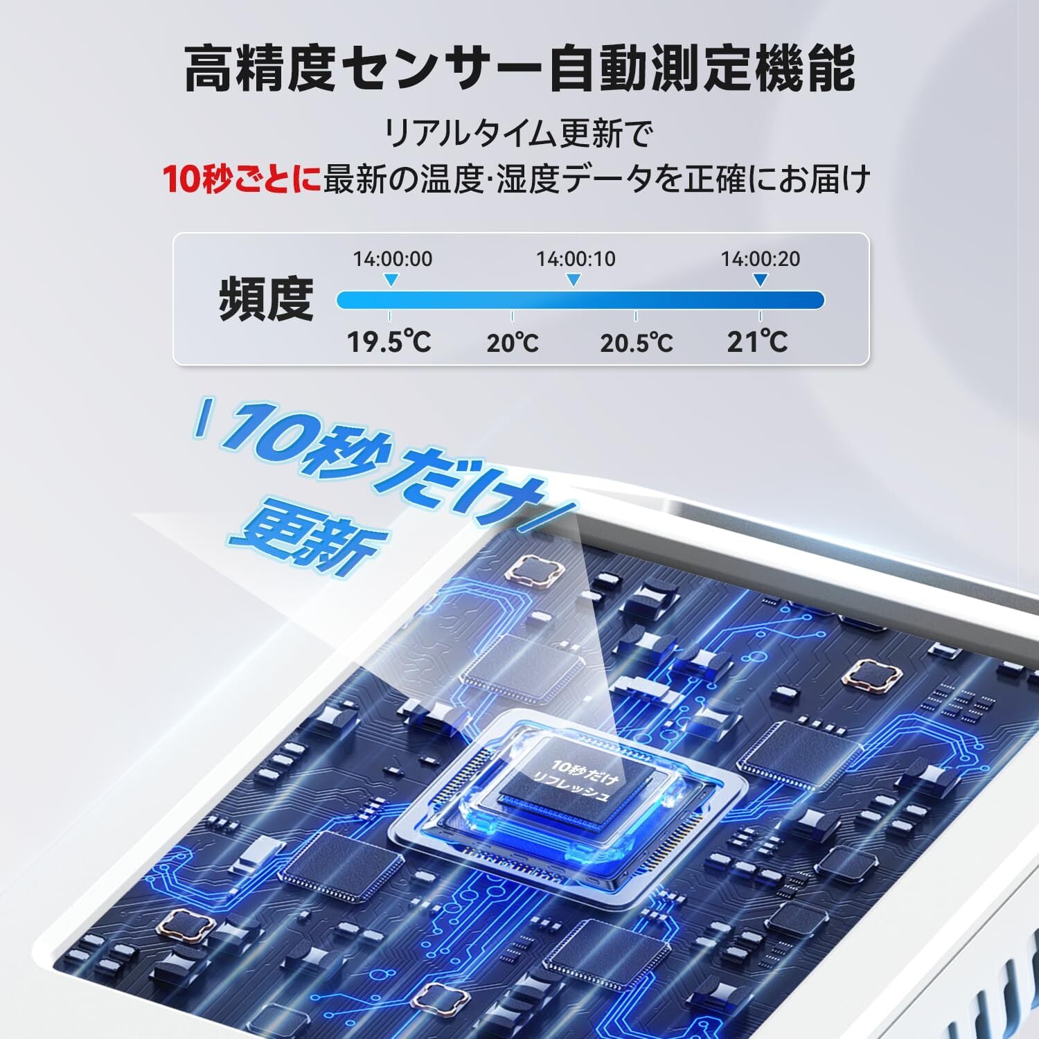 【見やすい温度湿度表示】この温度湿度計は手のひらサイズのコンパクトデザインで、どこにでも設置可能です。サイズは高さ7cm×幅4.2cm×奥行10.3cmと非常にスリム。テーブル、玄関、車内、ベッドサイドなど、目につきやすい場所に簡単に設置できます。コンパクトながら画面は大きく、表示も鮮明で見やすいです。